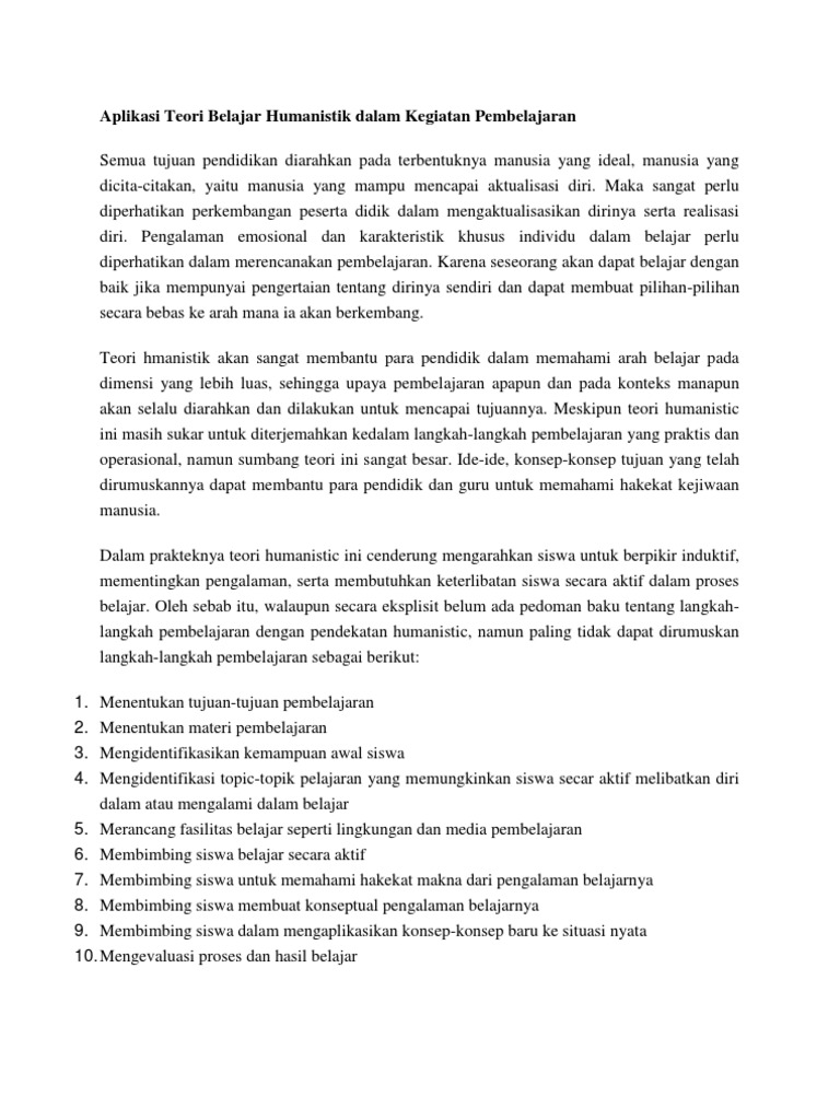 Contoh penerapan teori humanistik dalam pembelajaran. Peran guru dalam pembelajaran humanistik adalah menjadi fasilitator bagi para peserta didik sedangkan guru memberikan motivasi kesadaran mengenai makna belajar dalam kehidupan peserta didik. Proses belajar dianggap berhasil jika si pelajar memahami lingkungannya dan dirinya sendiri. Pendahuluan menurut teori humanistik tujuan belajar adalah untuk memanusiakan manusia. Pandangan tentang anak dari kalangan konstruktivistik yang lebih mutakhir yang dikembangkan dari teori belajar kognitif piaget menyatakan bahwa ilmu pengetahuan dibangun dalam pikiran seorang anak dengan kegiatan asimilasi dan akomodasi sesuai dengan skemata yang dimilikinya. Teori belajar humanistik dan penerapannya dalam pembelajaran 1. Teori humanistik adalah teori yang bersifat elektik yaitu teori yang dapat memanfaatkan teori apa saja asalkan tujuan pembelajaran tercapai.