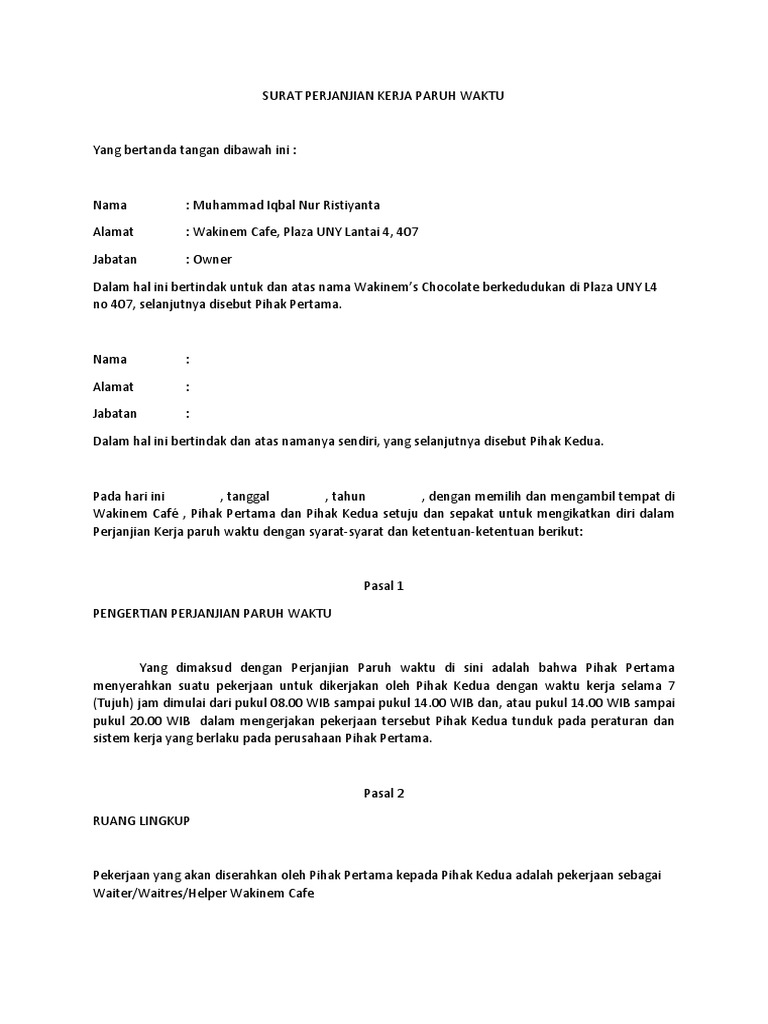 Contoh perjanjian kontrak kerja. Perjanjian kontrak kerja merupakan hal yang bersifat krusial dalam sebuah perusahaan. Contoh surat perjanjian kontrak kerja. Part time full time kontrak artikel ini berisi contoh surat perjanjian kerja yang diperuntukan bagi karyawan harian karyawan paruh waktu dan karyawan kontrak. Pihak pihak yang terkait yang tertulis dalam surat biasanya pihak 1 perusahaan dan pihak 2 karyawan. Contoh surat perjanjian kerja pada aktifitas kerja terdapat surat perjanjian yang digunakan untuk membuat kesepakatan antar pihak pihak yang terlibat dalam kerjasama. Dan ini juga untuk menjamin kepastian hukum di antara atasanpengusaha dengan pegawai apabila ada penyalahgunaan kontrak dengan sanksi seperti yang telah ditulis didalam surat tersebut.