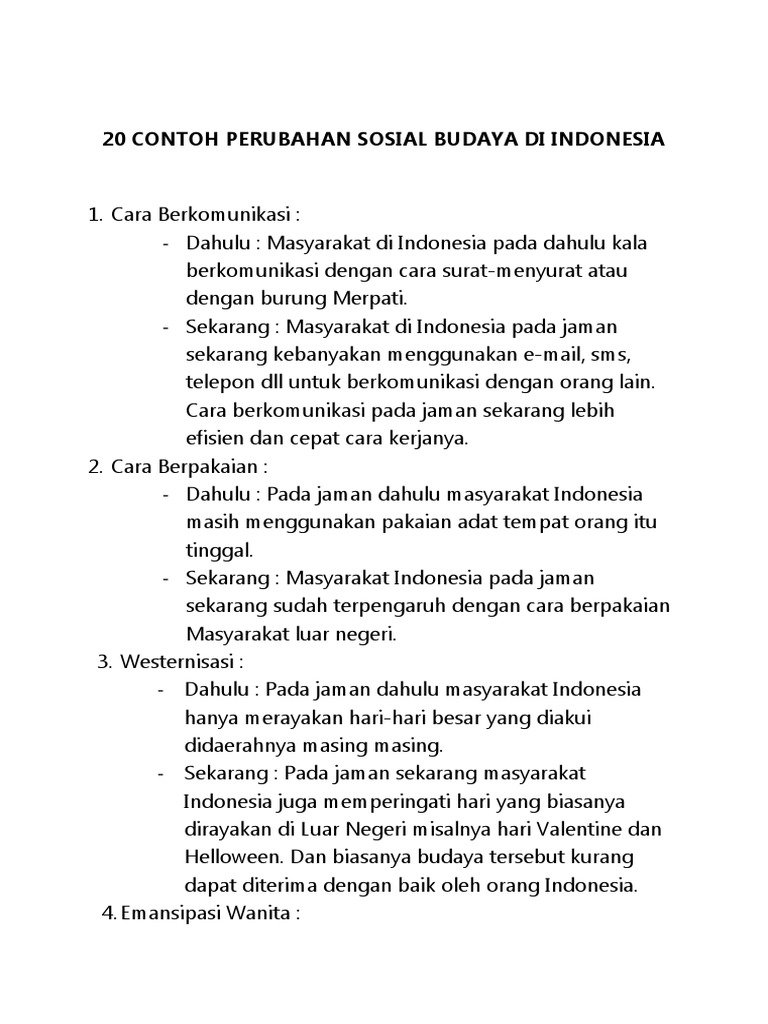 Dulu musik daerah mungkin cukup populer dan masih banyak diputar kini pengaruh musik western banyak yang masuk sehingga musik pop rock hip hop dan electro dance music edm kian populer pula. Contoh perubahan sosial budaya. Bahkansepeda pun di harapkan oleh pemerintah untuk mengatasi pemanasan global yangterjadi saat ini. Contoh lain yang dapat membuktikan bahwa perkembangan teknologi berlangsung begitu pesat misalnya pada jaman dahulu orang ingin berkomunikasi dengan keluarga yang jaraknya sangat jauh mereka harus mengirimnya lewat surat atau bahkan merpati yang waktu pengirimannya sangat lama dan memakan waktu berhari hari. Main bola enaknya ke lapangan bareng teman teman sekompleks sekarang sih mending duduk manis depan televisi. Oiya kalian juga bisa baca mengenai bentuk dan dampak perubahan sosial budaya untuk lebih memahami contoh contoh perubahannya jika sudah berikut ini 18 contoh perubahan sosial budaya yang sudah kami kumpulkan.
