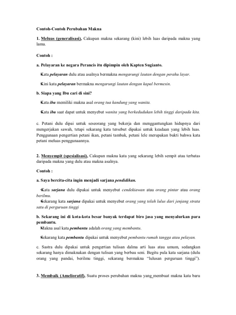 Contoh perubahan makna kata. Makna kata sekarang mengalami penurunan nilai rasa kata daripada makna kata pada awal pemakaiannya. Kakak kakak yang sebenarnya bermakna saudara sekandung yang lebih tua meluas maknanya menjadi siapa saja yang pantas dianggap atau disebut sebagai saudara yang lebih tua. Kata buta dimaknai sebagai keterbatasan seseorang dalam menggunakan salah satu panca indera manusia yakni pada indera penglihatan. Beberapa contoh kalimat peyorasi antara lain. Sebagai contoh perubahan makna kata sastra dari makna tulisan sampai pada makna karya imaginatif adalah salah satu contoh perkembangan bidang keilmuan. Perluasan makna generalisasi generalisasi adalah suatu proses perubahan makna kata dari yang khusus ke yang lebih umum atau dari yang lebih sempit ke yang lebih luas.