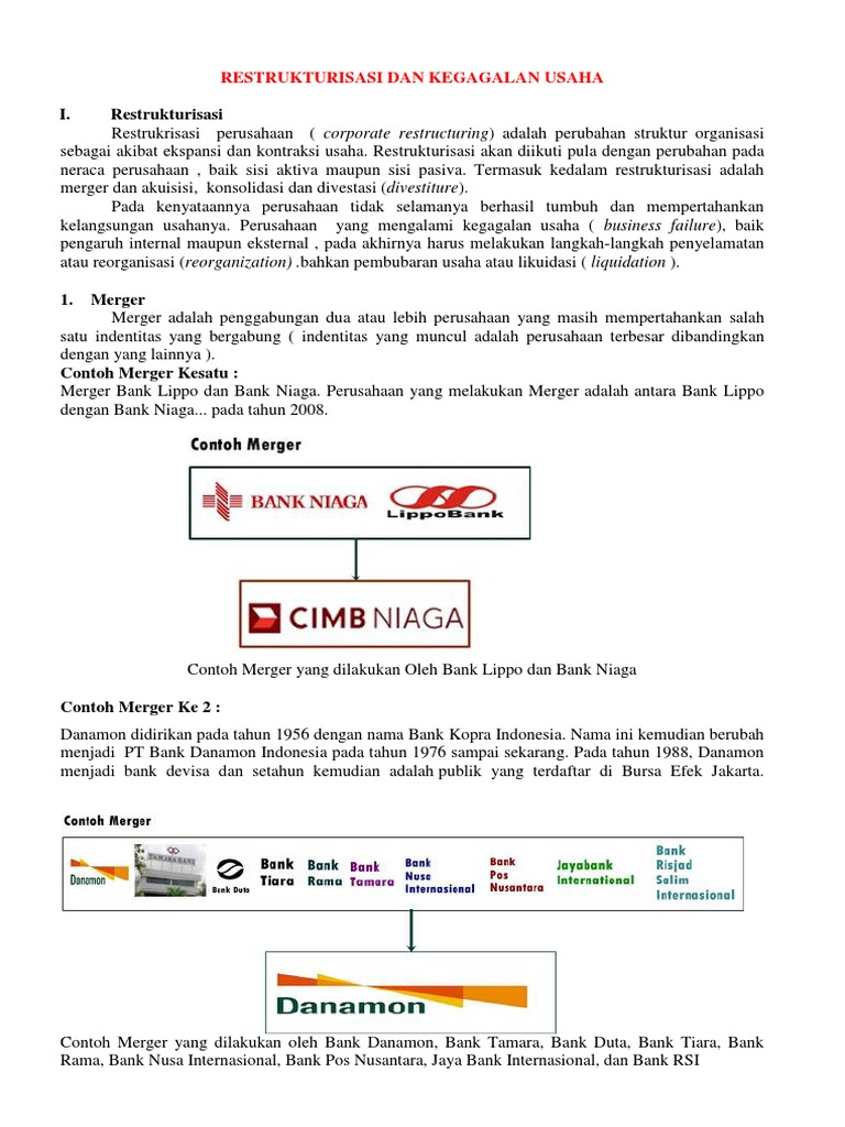 Contoh perusahaan yang melakukan merger. Tetapi saya hanya dapat list dri tahun 2010 2013 di sini. Contoh perusahaan yang melakukan konsolidasi adalah bbd bank bapindo bank dagang negara bank exim melakukan konsolidasi menghasilkan satu bank yaitu bank mandiri. Dimanakah saya bisa mendapatkan list dari tahun 2002. Tujuan merger akuisisi dan konsolidasi tidak lain adalah untuk mencapai pertumbuban bisnis memperkuat sistem struktur perusahaan diversifikasi produk dan meningkatkan kekuatan bisnis dalam persaingan. Contoh yang paling kuat saat ini adalah dorongan dari bank indonesia melalui kebijakan single presence agar bank bank nasional melakukan merger agar menjadi lebih efisien lebih kokoh dalam permodalan sehingga memiliki daya saing yang kuat secara internasional. Selain dikarenakan kesulitan likuiditas ada sejumlah alasan perusahaan melakukan merger seperti.