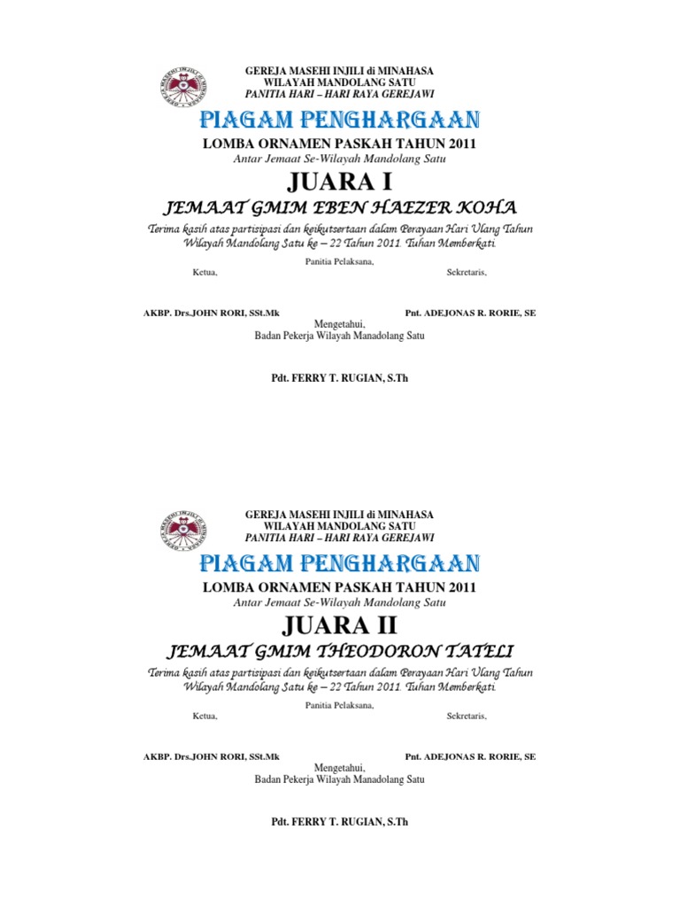 Piagam penghargaan lomba cerdas cermat alkitab bipra tahun 2011 antar jemaat se wilayah mandolang satu. Dan kita selaku panitia untuk mebuatnya sebuah piagam penghargaanjika belum punya nanti saya akan share format piagam penghargaan doc. Panitia pelaksana ketua sekretaris akbp. Memberikan piagam kepada pemenang peserta lomba atau juara kelas merupakan salah satu bentuk ucapan selamat secara simbolik. Yang menjadi masalah sekarang adalah bagaimana membuat desain piagam penghargaan keren yang menarik berkualitas dan sesuai dengan identitas perusahaan maupun kantor. Diterbitkan november 21 2018.