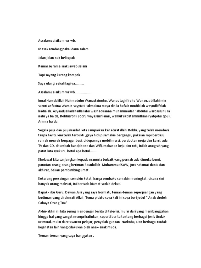 Contoh pidato untuk anak anak anak sholeh dambaan orang tua anak sholeh dambaan orang tua السلام عليكم ورحمة الله وبركا ته hamdan wa syukron lillah solaatan wa salaaman ala rosulil. Pengertian pidato anak sholeh. Mudah mudahan pidato saya bermanfaat bagi kita semua. Pidato anak sholeh hal ini merupakan salah satu kegiatan untuk menuntut bakat dalam pergaulan anak yang shaleh dan shalehah sehingga dapat di pastikan membanggakan bagi orang tuanya di hari akhirat kelak. Anak sholeh tentunya sebiah yang di damba dambakan bagi orang tua karena hal ini merupakan salah satu keberhasilan dalam mendidikan dan contoh dalam prilaku. Pidato tentang anak sholeh dan sholehah adalah contoh teksnaskah pidato keagamaan menggunakan bahasa indonesia.