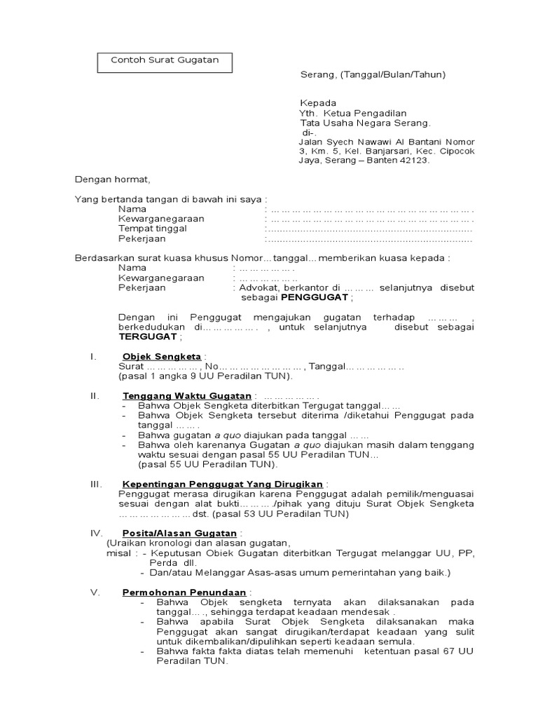 Petitum berdasarkan uraian tersebut penggugat memohon kepada pengadilan tata usaha negara bandar lampung untuk memeriksa memutus serta menyelesaikan berdasarkan hukum keadilan dan kebenaran sebagai berikut. Petitum berisi tuntutan apa saja yang dimintakan oleh penggugat kepada hakim untuk dikabulkan. Petitum surat gugatan berisi pokok tuntutan gugatan berupa permintaan kepada pengadilan dengan deskripsi yang jelas menyebut satu per satu dalam akhir gugatan tentang hal hal apa saja yang menjadi pokok tuntutan penggugat yang harus dinyatakan dan dibeberkan kepada tergugat. Yahya harahap di dalam buku hukum acara perdata hal. Adapun gugatan ini diajukan berdasarkan alasan dan dalil dalil sebagai berikut. Jadi kalau tidak pernah diuraikan terlebih dulu alasan alasan hukumnya pada bagian posita maka hal itu tak dapat dituntut dan diajukan pada bagian petitumnya.