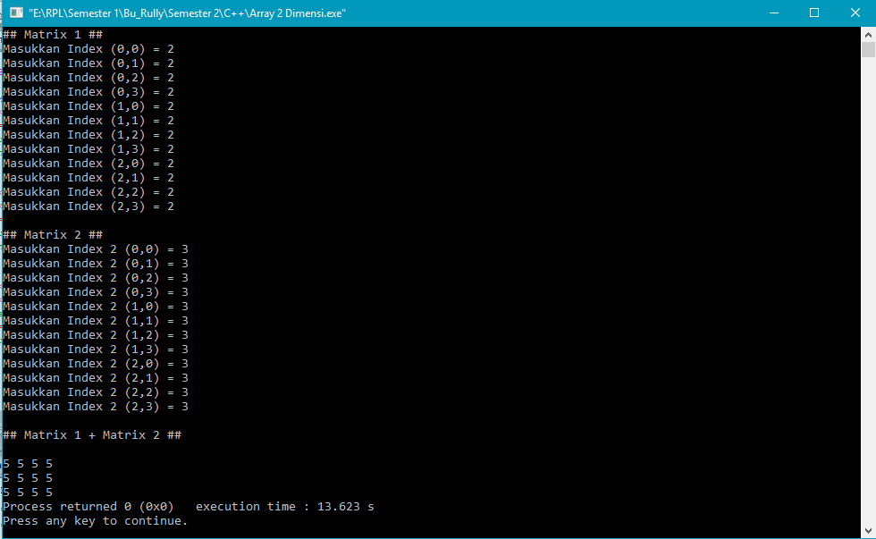 Contoh program c array 2 dimensi. Contoh program c array 2 dimensi. Sama halnya dengan array 1 dimensi array 2 dimensi juga memiliki cara yang sama dalam pendeklarasiannya. Contoh array 2 dimensi di bawah ini adalah bagaiamana cara melakukan input data ke dalam matriks a dan matriks b dan menampilkannya hasil input datanya. Sekian artikel mengenai array dua dimensi c lengkap contoh program dan penjelasan. Contoh penggunaan dari array 3 dimensi adalah seperti diagram kartesius 3 dimensi dimensi ruang yang butuh sumbu x lebar y tinggi dan z kedalaman. Dalam program diatas saya ingin menjumlahkan nilai dari tiap index umur dan hasilnya saya simpan kedalam variabel hasil untuk ditampilkan di akhir program.