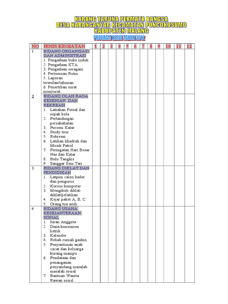 Contoh program kerja karang taruna. Pendidikan dan pelatihan proram kerja jangka pendek 1. Karang taruna bisa diartikan secara singkat sebagai wadah pemuda. Sinergitas program dengan kebijakan pemerintah menjadi agenda penting penetapan program hal ini dikarenakan posisi karang taruna sebagai mitra pemerintah dalam upaya penanganan permasalahan permasalahan sosial di kecamatan tanjungkerta yang memiliki peran strategis sebagai salah satu komponen organisasi sosial kemasyarakatan yang tumbuh dan berkembang sampai ke pelosok desa. Program kerja adalah garis besar haluan kerja karang taruna desa imam sudhiarto satu periode kepengurusan lima tahunan yang harus diperhatikan dan digunakan sebagai pegangan oleh masing masing bidang dalam rangka menyusun program kerja maupun dalam menjalankan roda organisasi. Karang taruna menjadi salah satu partner pemerintah desa untuk bisa mewujudkan kemajuan perekonomian masyarakatorganisasi ini dianggap sebagai tolak ukur kesuksesan para pemuda pemudi desa seberapa kreatif dan berkembangnya dalam upaya membangun desa. Program kerja karang taruna presma disesuaikan dengan situasi dan kondisi generasi muda dan masyarakat di desa kalilunjar.