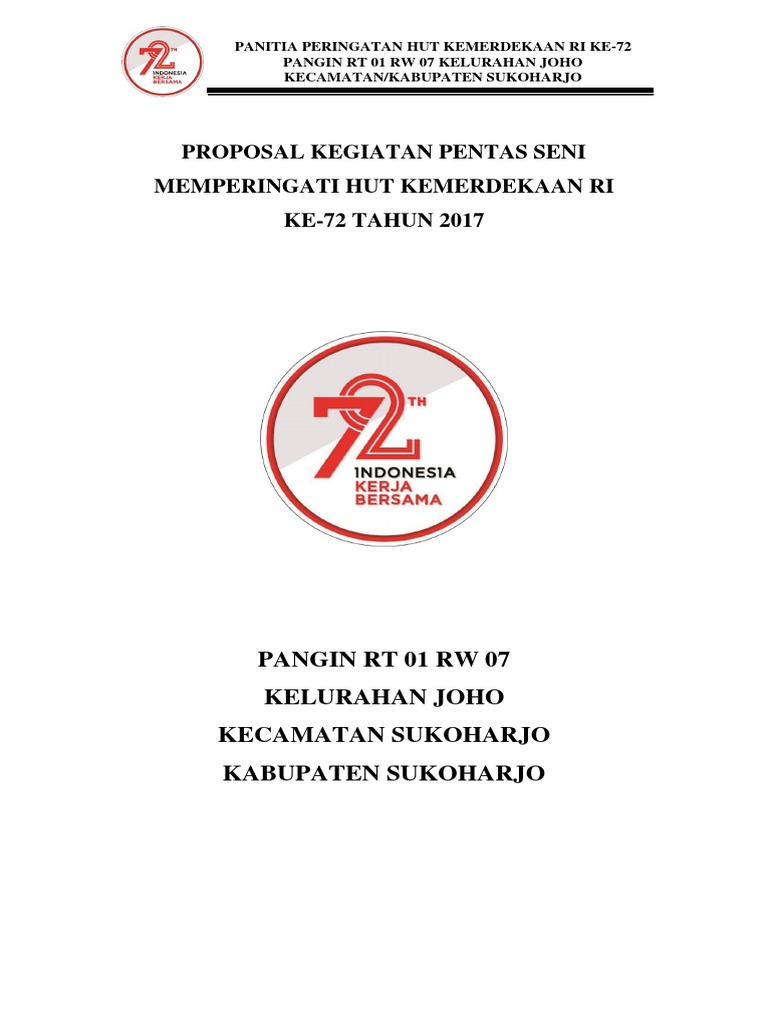 Contoh proposal hut ri ke 72. Tujuan adapun tujuan diadakannya acara ini poncowidodo rt 31 dan tanjung sari rt 11. Tema hut ri ke 72 indonesia gotong royong serta kita perkuat ketahanan nasional menghadapi tantangan global dan perkuat ketahanan nasional. Proposal kegiatan peringatan hut kemerdekaan republik indonesia ke 72 hasil gambar untuk 72 tahun hut ri di adakan oleh remaja dusun karet mengadakan resepsi hut ri ke 72 dusun karet desa losari kecamatan ampelgading kabpemalang tahun 2017 kata pengantar dengan hormat berkat rahmat tuhan yang maha esa atas nikmat yang telah diberikan nya baik sehat jasmani maupun rohani sehingga. Hal tersebut tampak di berbagai wilayah indonesia mulai muncul pedagang yang menjual berbagai atribut seperti bendera merah putih umbul umbul dan berbagai. Contoh proposal dana hut ri 72 unknown. Sasaran dan peserta peringatan hut ri ke 73 yaitu siswa siswi kelas xi dan xii.
