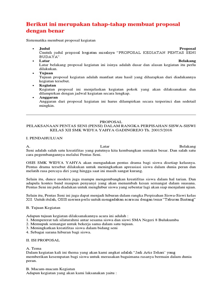 Contoh proposal kegiatan osis. Ekspose prestasi dan kreativitas siswa ekspresi sma negeri 11 makassar tahun 2013. Contoh proposal kegiatan proposal adalah rencana kegiatan yang dituliskan dalam bentuk rancangan kerja yang akan dilaksanakan. Definisi proposal sendiri adalah gambaran detail mengenai sebuah kegiatan yang akan diadakan meliputi waktu tempat peserta panitia hingga anggaran dana. Rancangan kerja tersebut nantinya akan dilaksanakan sebagai suatu program. Rencana tersebut harus dituliskan agar pihak yang berkepentingan dapat memahami dengan baik.