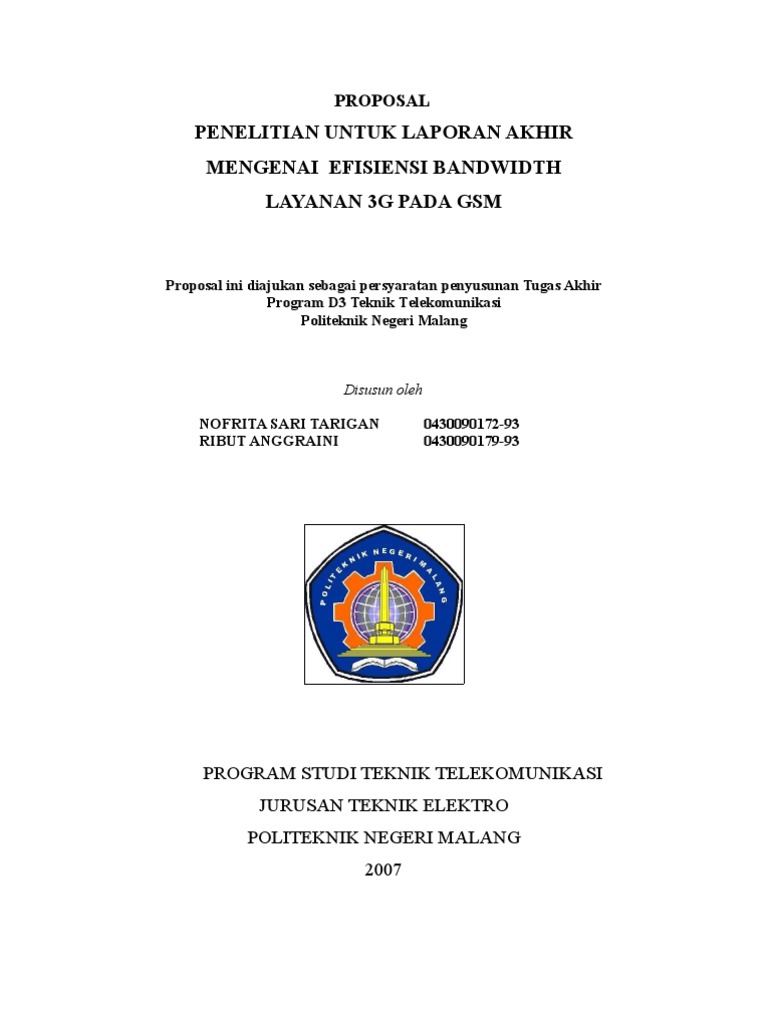 Proposal penelitian adalah salah satu jenis karya ilmiah yang bertujuan untuk mengusulkan proyek penelitian baik dalam bidang sains maupun untuk kepentingan akademisi dan berharap agar sponsor mendanai penelitian tersebut. Program studi diii manajemen informatika jurusan teknik elektro politeknik negeri bali 2013 margin kertas.