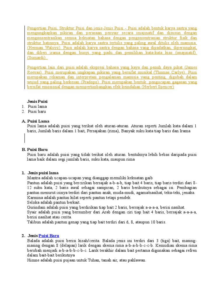 Pengertian puisi balada ciri ciri dan contoh balada lengkap balada adalah salah satu jenis puisi baru yang berisi tentang sebuah kisah atau cerita tertentu. Balada terdiri atas 3 bait dengan tiap bait terdiri atas 8 baris dan berima a b a b c c b kemudian beralih jadi berima a b a b b c c b c. Puisi baru berdasarkan isinya. Berdasarkan isinya puisi baru dibedakan menjadi. Berdasarkan isi atau bahasan dalam puisi puisi baru dibedakan menjadi 7 jenis yaitu balada himne ode epigram romansa elegi dan satire. Jenis puisi baru berdasarkan isi.