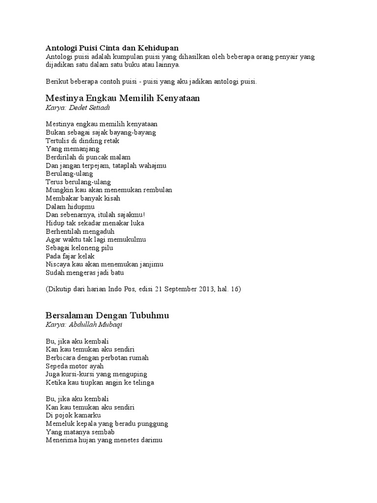 Contoh puisi karya sendiri. Kedua karyanya yang kini masih tinggi eksistensi yaitu puisi yang berjudul aku dan krawang bekasi. Puji syukur atas kehadirat tuhan yang mahaesa karena atas karunia dan rahmatnya lah kita masih diberikan kesempatan dan kesehatan sehingga makalah yang berjudulpembacaan puisi karya sendiri dari segi lafal intonasi penghayatan dan ekspresi yang sesuai dapat terselesaikan dengan sebaik baiknya. Pengertian puisi bebas setelah dipostingan sebelumnya kita membahas dan menyimak tentang puisi kontemporer beserta contohnya dipostingan kali ini kita akan lebih mengenal tentang puisi bebas. Contoh puisi diatas tidak melulu tentang cinta seperti seperti karya widji thukul yang sering mengangkat tema kritik terhadap kekuasaan ada yang tentang ibu dimata kahlil gibran tentang bagaimana kehidupan dimata ws rendra petualangan khas chairil anwar puisi model kontemporer karya sutardji. Puisi sendiri dibedakan menjadi dua yaitu puisi lama dan puisi baru untuk lebih jelasnya langsung saja perhatikan contoh contoh puisi dibawah ini. Dan memutuskan jatuh cinta kepada diri sendiri.