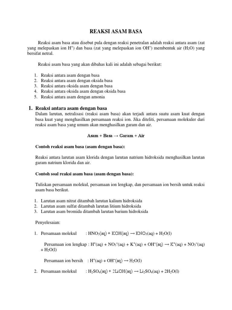 Contoh soal reaksi asam dan basa antara asam dengan basa dengan pertanyaan seperti ini tuliskan persamaan dari molekul persamaan ion lengkap dan persamaan ion bersih untuk reaksi asam dan basa larutan asam nitrat yang ditambahkan dengan larutan kalium hidroksida. Berikut adalah sepuluh macam reaksi reaksi dari larutan asam dan basa. Contoh asam mineral adalah asam klorida yang digunakan secara luas dalam industri asam sulfat untuk aki mobil dan asam fluorida yang biasanya digunakan pada pabrik kaca. Garam seperti ch 3 coonh 4 yang dapat terbentuk dari reaksi asam lemah ch 3 cooh dan basa lemah nh 3 akan mengalami hidrolisis kation dan anionnya. Untuk yang garam postingan selanjutnya aja ya he he. Pengertian asam basa sifat teori dan contoh reaksi asam basa terlengkap tentu saja kita sering mendengar istilah asam basa dalam kimia.