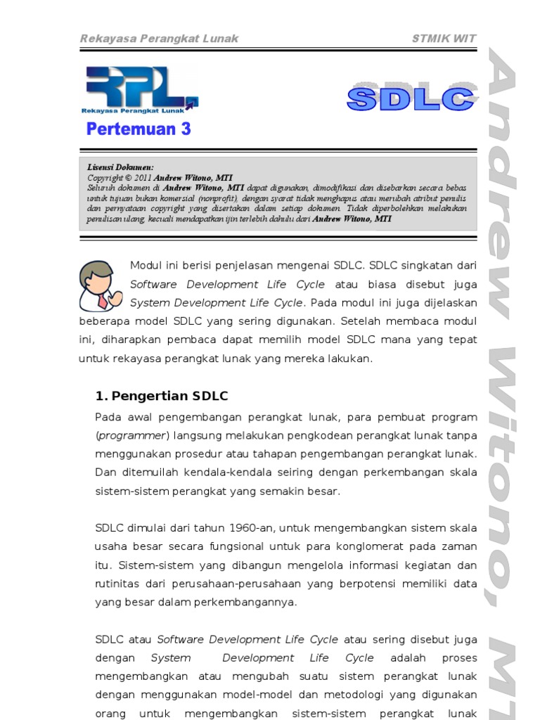 Ti harus direncanakan dengan hati hati dan dilaksanakan dengan mengikuti petunjuk kesuksessan ti dari perusahaan. Sdlc atau software development life cycle atau sering disebut juga system development life cycle adalah proses mengembangkan atau mengubah suatu sistem perangkat lunak yang memakai metodologi yang dipakai oleh orang untuk mengembangkan sistem sistem perangkat lunak sebelumnya berdasarkan pengalaman terbaik atau cara cara yang sudah pasti terjamin sangat baik.