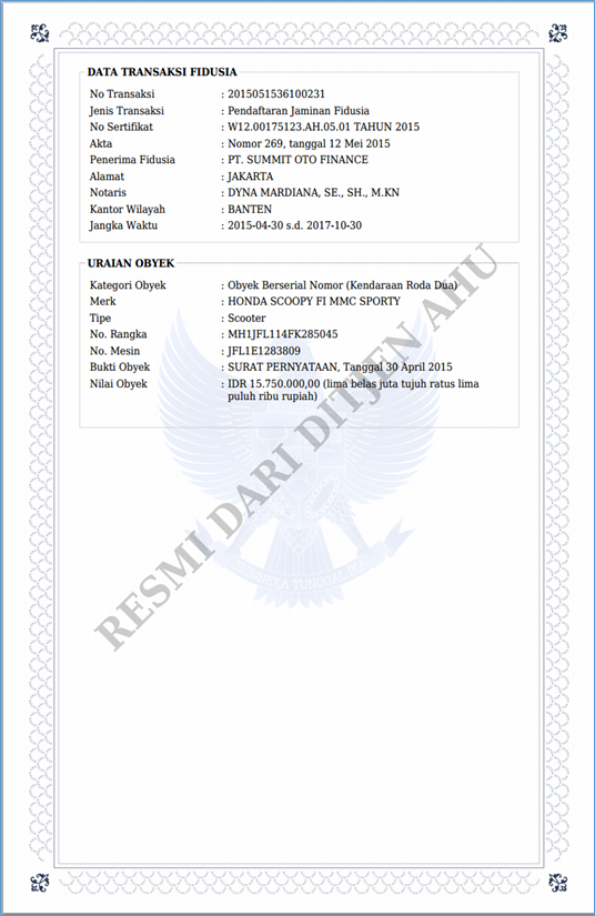Republik indonesia kantor wilayah nusa tenggara barat kantor pendaftaran jaminan fidusia sertifikat jaminan fidusia nomor. Bahkan apabila debitor mengalihkan benda objek fidusia yang dilakukan dibawah tangan kepada pihak lain tidak dapat dijerat dengan uu.