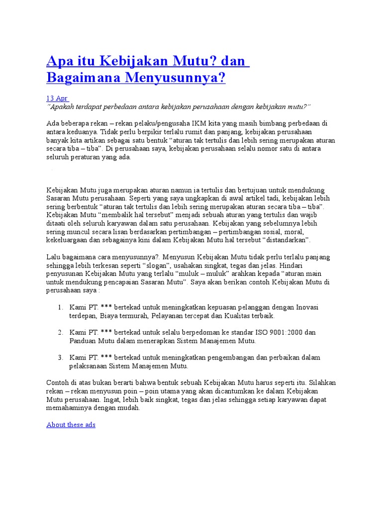 Contoh sistem manajemen perusahaan. Pengertian quality management vibizmanagement quality manajemen mutu adalah aspek aspek dari fungsi manajemen keseluruhan yang menetapkan dan menjalankan kebijakan mutu suatu perusahaanorganisasi. Dalam rangka mencukupkan kebutuhan pelanggan dan ketepatan waktu dengan anggaran yang hemat dan ekonomis seorang manager proyek harus memasukkan dan mengadakan. Kebijakan mutu merupakan salah satu dokumen yang wajib dimiliki oleh setiap perusahaan atau organisasi yang menerapkan sistem manajemen mutu iso 90012008. Antara lain sistem manajemen mutu iso 9001 sistem manajemen lingkungan iso 14001 sistem manajemen resiko iso 31000 dan lain lain. Berikut beberapa contoh kebijakan mutu untuk meninjau beberapa informasi yang sangat mendasar tentang produk xyz dan kemudian lihat bagaimana kebijakan kualitas mencerminkan tujuan konteks dan arah strategis seperti tujuan sistem ekonomi terpusat.