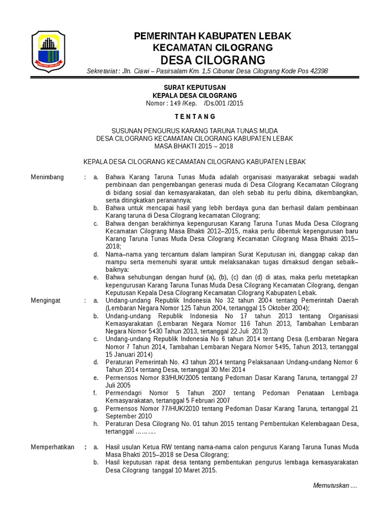 Bahwa karang taruna merupakan organisasi sosial wadah pengembangan generasi muda yang mampu menampilkan karakter melalui cipta rasa dan karya di bidang kesejahteraan sosial. Simpan simpan contoh sk karang taruna untuk nanti. Keputusan kepala desa mataiwoi. Academiaedu is a platform for academics to share research papers. Sk akan dikeluarkan oleh pihak tertentu baik dari dinas kabupaten kecamatan dan desa sesuai dengan peraturan yang ada. Kecamatan mowila kabupaten konawe selatan.