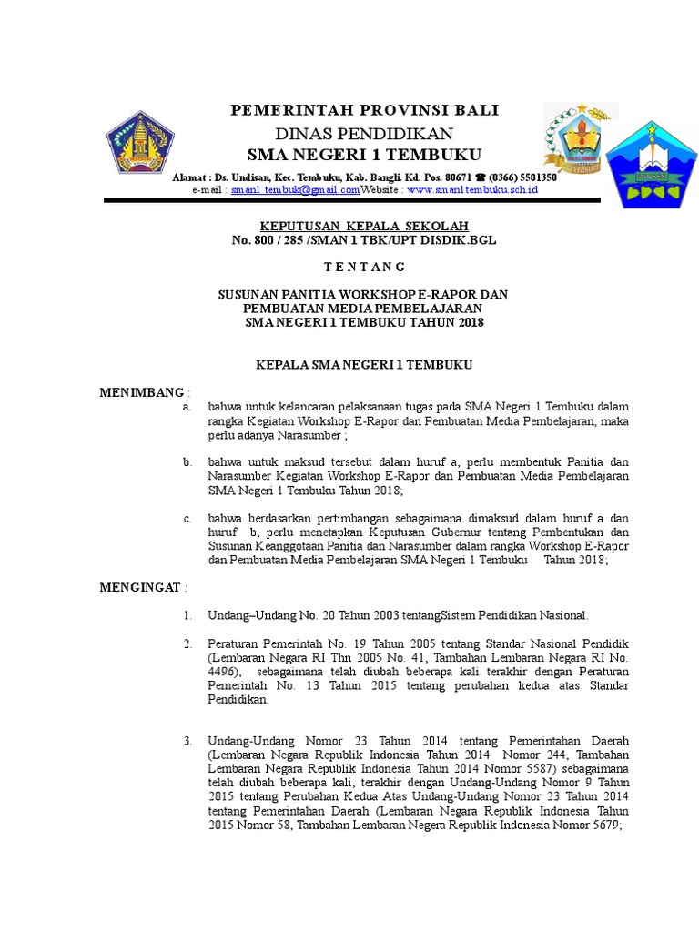 Contoh sk panitia kegiatan pelatihan. Bahwa pembentukan kepanitian dalm kegiatan latihan dasar kepemimpinan ldk. Bahwa mereka yang namanya tercantum dalam lampiran lampiran keputusan ini. Kumpulan contoh surat keputusan sk kepala sekolah lengkap administrasi sekolah sk kepala sekolah surat keputusan atau yang biasa lebih dikenal dengan sk merupakan sebuah surat pernyataan yang dikeluarkan oleh lembaga tertentu formal maupun non formal yang berisi suatu kebijakan atau keputusan tertentu yang berhubungan dengan lembaga tersebut. Merencanakan kegiatan teknis persiapan dan pelaksanaan pelatihan. Kami mengucapkan terima kasih kepada pihak yang telah memberikan bantuan sehingga kegiatan bimbingan teknis jurnalistik televisi dan sinematografi insya allah akan terlaksana dengan baikpada kesempatan ini pula kami menyampaikan permohonan maaf apabila terdapat kekurangan dan kesalahan dalam proses pelaksanaan kegiatan bimtek ini. Contoh surat keputusansk pembentukan panitia pelaksanaan pekerjaan pembangunan ruang kelas baru.