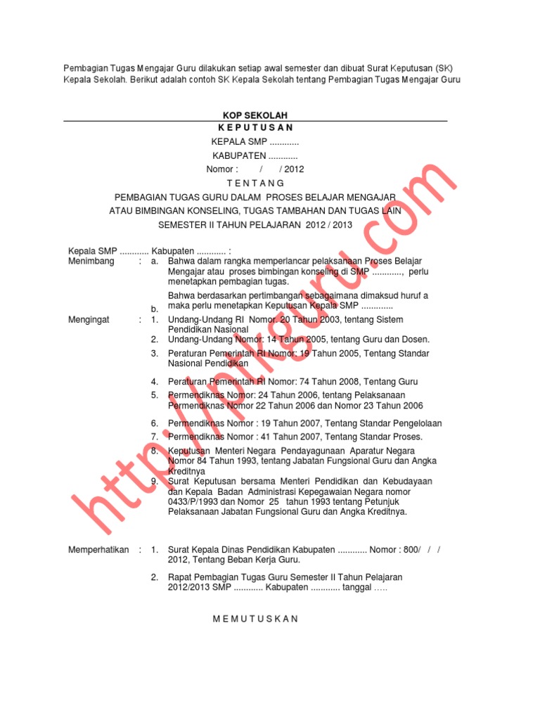 Tes akademik calon kepala sekolah contoh instrumen respon. Download format doc ms. Berikut ini contoh sk pembagian tugas mengajar 20192020 di tkpaud sdmi smpmts smasmkma dilengkapi lampiran. Berikut contoh sk pembagian tugas mengajar bagi guru dengan format terbaru untuk tahun pelajaran 20162017 untuk semester 1 maupun semester 2 nantinya dan dalam format ini tetap ada penambahan jumlah pada masing masing rombel yang diampu seperti yang sudah saya bagikan sebelumnya. Pada posting ini saya mencoba menampilkan contoh sk pembagian tugas guru sk kbm tahun pelajaran 20182019 mengingat dari hasil supervise pada beberapa sekolah binaan masih banyak sekolah yang belum mengupdate dan masih keliru dalam penomoran surat keputrusan atau sk. Guna mempermudah pembuatan sk dimaksud kami bagikan contoh sk pembagian tugas mengajar tahun ajaran 2017 2018.