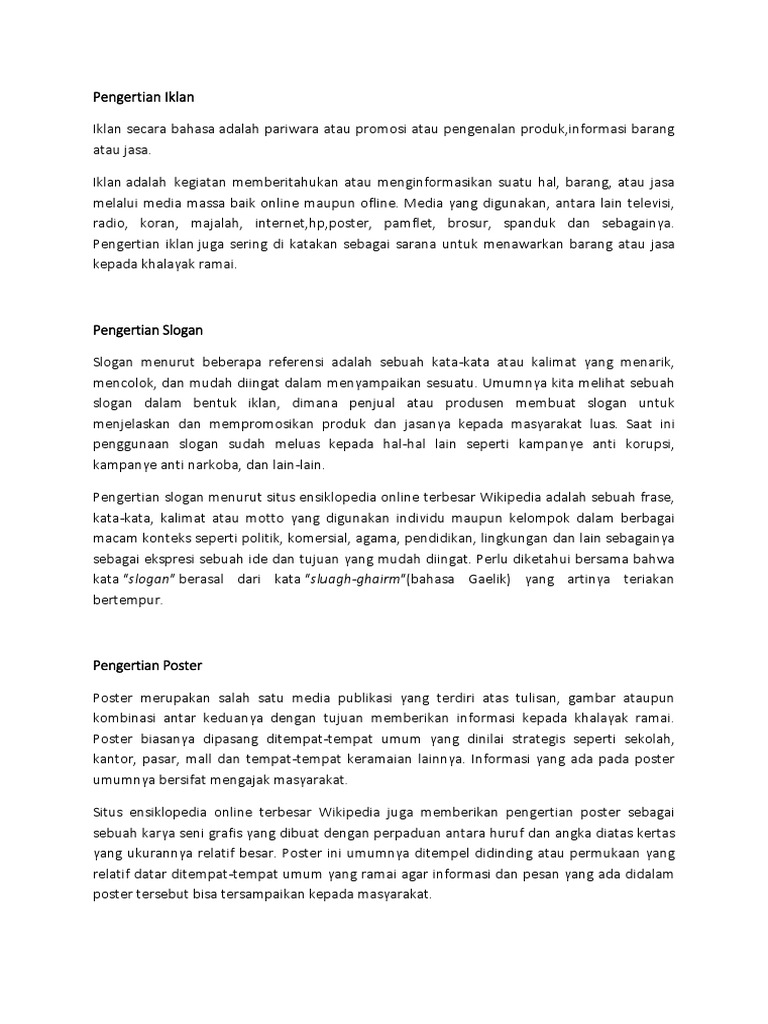 Contoh iklan baris pengertian iklan baris adalah salah satu jenis promosi iklan barang atau jasa di koran dalam bentuk teks singkat terbatas. Aneka hijab untuk si kecil begitu membaca slogan di atas pengunjung yang sedang mencari hijab untuk anak akan tinggal sementara pengunjung lain akan segera meninggalkan website. Contoh slogan merek dan perusahaan terbaik beberapa pilihan dan strategi pemasaran untuk merek produk atau perusahaan lebih dikenal dan diingat. Pembuatan iklan baris sangat simpel dan umumnya dibuat dalam 2 4 baris saja. Lalu apa saja contoh dari kata kata untuk promosi olshop yang bisa kamu. Barang akan mudah dikenal masyarakat apabila kita mengiklankan produkjasa tersebut karena dalam waktu sekejap produkjasa tersebut bisa dilihatdibacadidengar masyarakat tergantung tingkat cangkupannya.