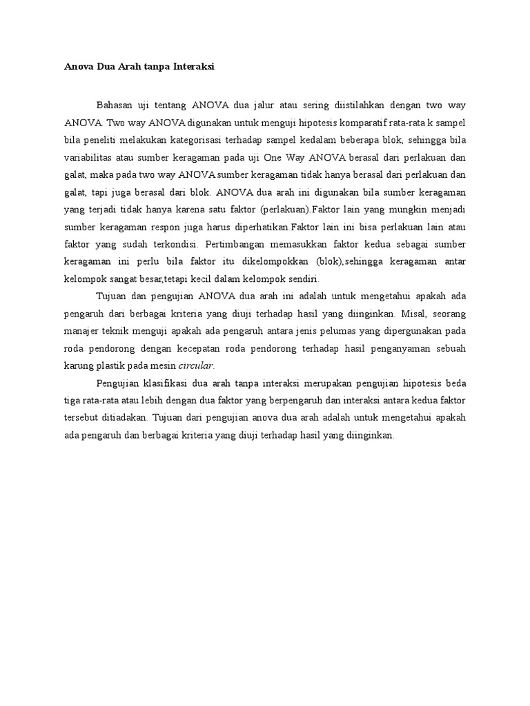 Pengujian anova dua arah tanpa interasi merupakan pengujian hipotesis beda tiga rata rata atau lebih dengan dua faktor yang berpengaruh dan interaksi antara kedua faktor ditiadakan. Konsepnya hampir sama jika ingin membandigkan dengan anova lainnya. Uji analisis anova atau sering disebut dengan istilah uji f ini secara umum dibedakan menjadi 2 dua macam yakni uji anova. Kemudian kelompok yang dianalisis berasal dari kelompok saling bebas.
