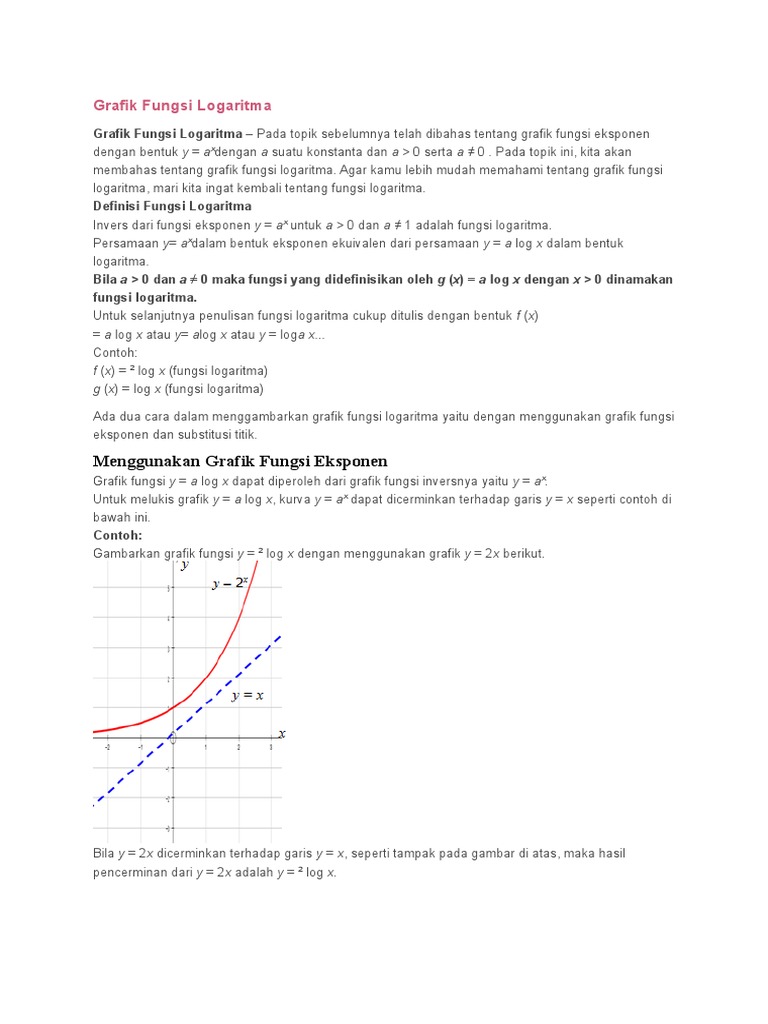 Hal ini berarti bahwa grafik fungsi g x a log x dapat diperoleh dengan mencerminkan grafik f x. Melukis grafik untuk lebih jelasnya ikutilah contoh soal berikut ini. Dalam hal ini kita akan menggambar fungsi y 2 log x. Grafik fungsi eksponen f x a x dan grafik fungsi logaritma g x a log x simetri terhadap garis y x. Rumus sifat fungsi persamaan dan contoh soal belakangan ini ilmu matematika telah berkembang pesat. Dan untuk grafik fungsi logaritma sebenarnya sudah kami share sebelumnya dengan artikel yang berjudul fungsi logaritma.