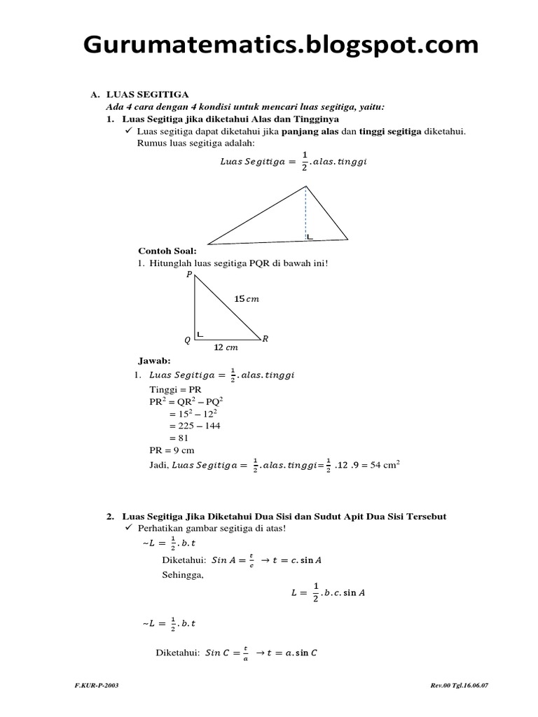 Nah itulah pembahasan lengkap materi luas segitiga trigonometri berikutnya kita akan belajar rumus jumlah dan selisih trigonometri. Mereka poligon reguler dan sebab itu bisa juga disebut sebagai segitiga regular. Sebelum mencoba untuk memahami contoh soal di bawah ini alangkah baiknya anda membaca terlebih materi tentang cara mencari keliling dan luas segitiga. Sedangkan luas segitiga siku siku menggunakan rumus l 12 x luas alas x tinggi. Hitunglah luas segitiga tersebut. Tentukan luas daerah dari segitiga tersebut.