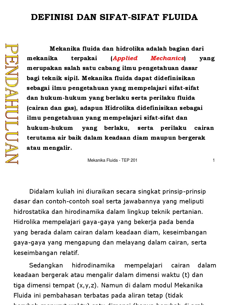 1 rapat massa berat jenis rapat relatif volume spesifik kompresibilitas tegangan permukaan viskositas tekanan hidrostatis 2 hukum kekekalan massa energi dan momentum. Tujuan dari pembuatan bahan ajar ini adalah untuk memudahkan mahasiswa dalam hal memahami pelajaran mekanika fluida.