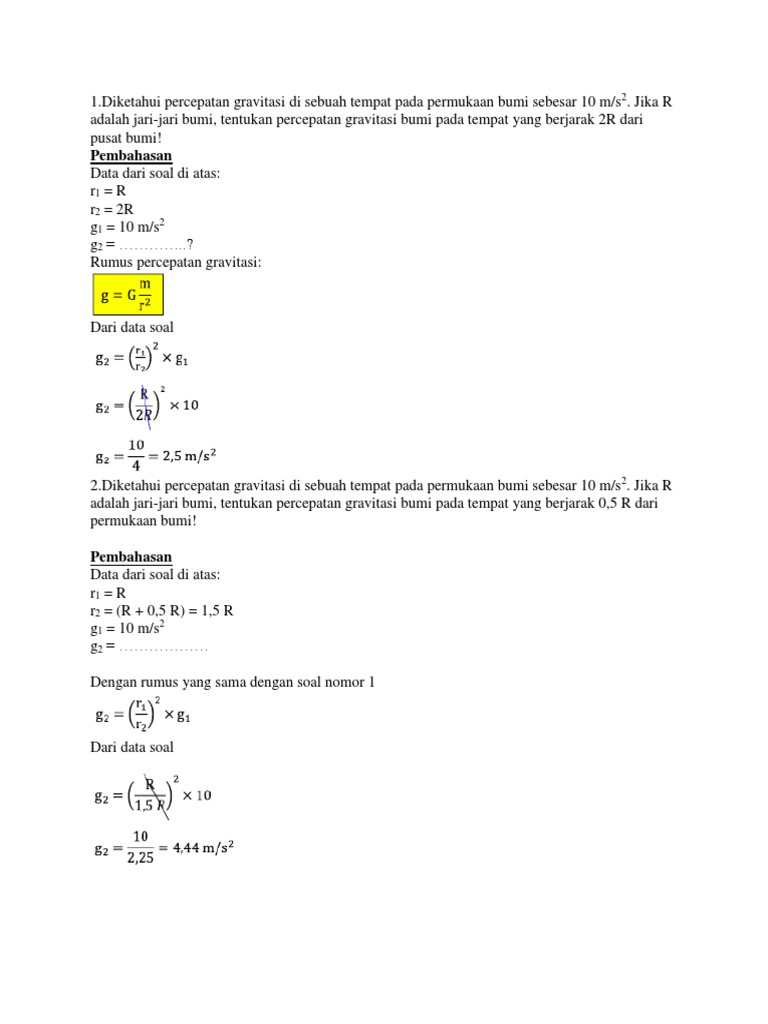 Contoh soal percepatan gravitasi. Download modul pelajaran soal dan rumus percepatan gaya gravitasi lengkap smp sma. Jadi percepatan gravitasi pada ketinggian tersebut adalah 116 percepatan gravitasi bumi atau berkurang menjadi 1016 ms2 dan berat benda menjadi berkurang 200 n. Massa bulan 735 x 10 22 kg jari jari bulan 1740000 meter konstanta gravitasi umum g 667 x 10 11 n m 2 kg 2 pembahasan rumus hukum ii newton. Beberapa soal fisika sering menanyakan tentang perbandingan gravitasi di dua buah planet yang berbeda. Contoh soal percepatan gravitasi 1diketahui percepatan gravitasi di sebuah tempat pada permukaan bumi sebesar 10 ms 2. Konstanta gravitasi 667 x 10 11 nm 2 kg 2.