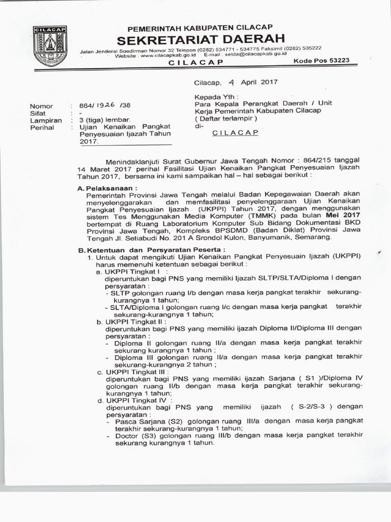 Pelaksanaan pemerintah provinsi jawa tengah melalui badan kepegawaian daerah akan menyelenggarakan dan memfasilitasi penyelenggaraan ujian kenaikan pangkat penyesuaian ijazah ukppi tahun 2017 dengan menggunakan sistem tes menggunakan media komputer tmmk pada bulan mei 2017 bertempat di ruang laboratorium komputer sub bidang dokumentasi bkd provinsi jawa tengah kompleks bpsdmd badan. Jika anda membutuhkan contoh soal ujian dinas kenaikan pangkat dan soal ujian dinas penyesuaian ijazah dan karya tulis ilmiah silahkan kontak kami di.
