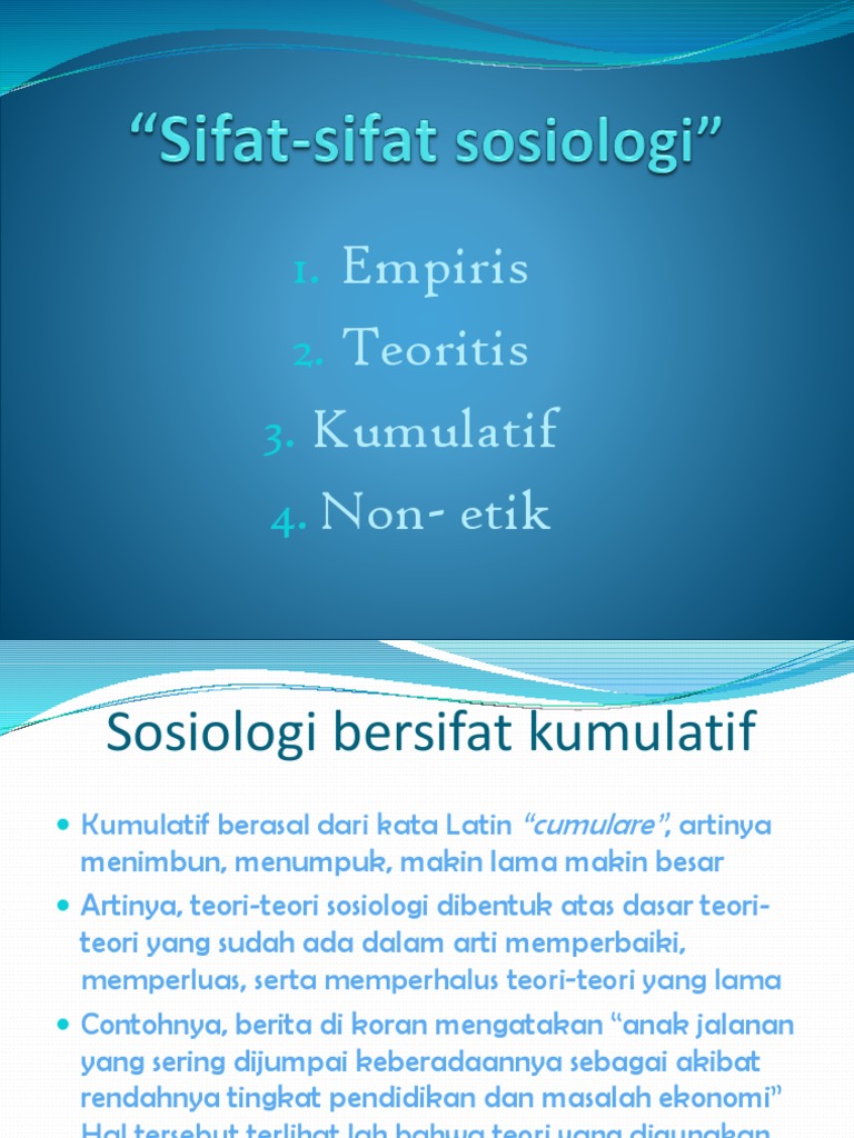 Artinya sosiologi merupakan ilmu yang berdasar dari hasil pengamatan observasi dan penalaran terhadap berbagai kenyataan sosial yang terjadi dan hasil dari observasi ini tidak bersifat spekulasi. Keenam sosiologi adalah ilmu pengetahuan yang empiris dan rasional. Alasan ini diungkapkan karena sosiologi dalam perkembangannya selalu memberikan langkah penelitian yang sistematis dan sesuai dengan realita. Empiris teoritiskumulatif dan non etis merupakan sifat dasar sosiologi. Empiris artinya sosiologi sebagai ilmu pengetahuan didasarkan pada observasi terhadap kenyataan menggunakan akal sehat dan indra sehingga hasilnya tidak bersifat spekulatif. Jelaskan bahwa sosiologi bersifat empiris teoritis komulatif nonetif 3504905.