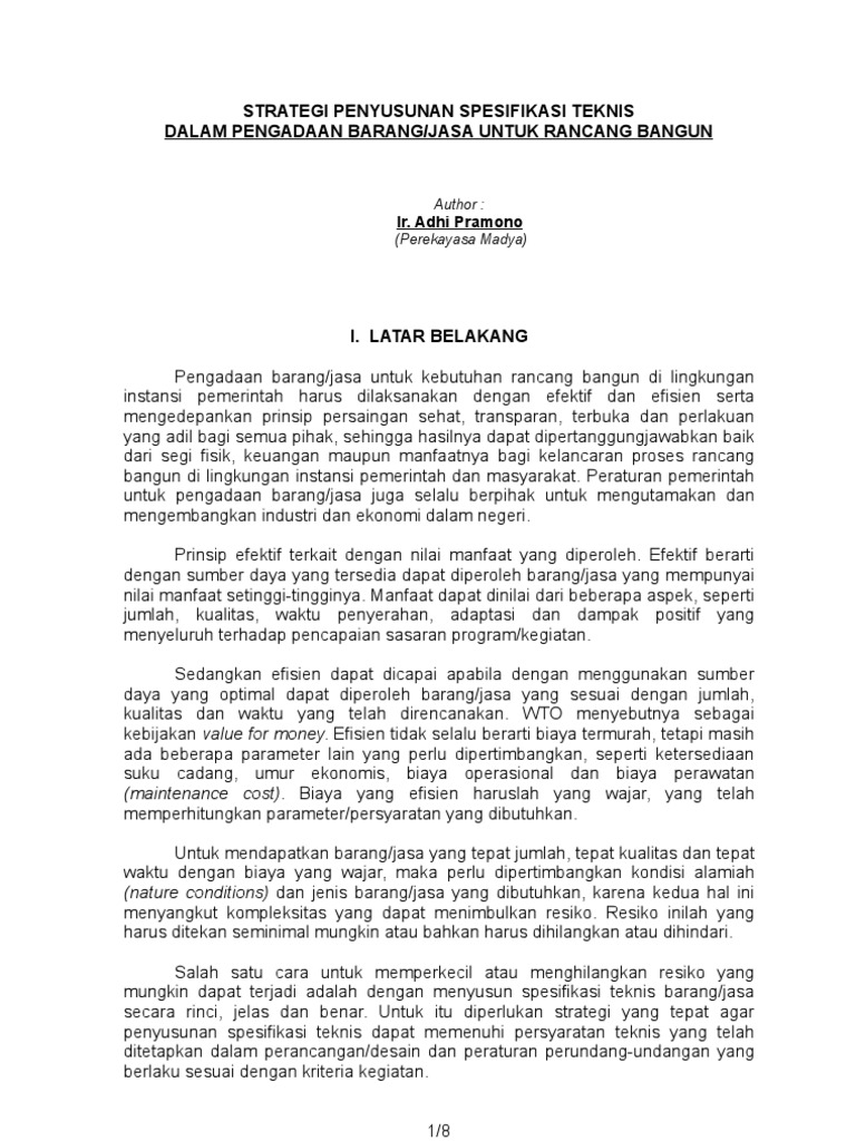 Ppk menetapkan rencana pelaksanaan yang terdiri dari hps spesifikasi teknis dan rancangan spk. Dalam menetapkan spesifikasi teknis ppk memperhatikan spesifikasi teknis dalam rencana umum pengadaan dan masukanrekomendasi dari pengguna penerima akhir. Untuk memudahkan anda dalam penyusunan kak kami telah membuatkan formatdraft baku susunan kerangka acuan kegiatan tersebut berikut. Atau pekerjaan yang spesifikasi teknis atau volumenya dapat dinyatakan secara jelas dalam dokumen. Standard pbi 1971 astm 3 besi beton dim. Peserta mampu menyusun spesifkasi teknis pengadaan barangjasa yang sesuai dengan kebutuhan dan paket pengadaan barangjasa untuk berbagai jenis pengadaan barangjasa.