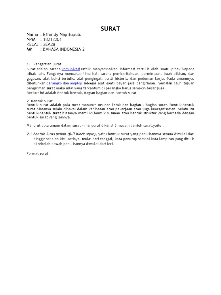 Contoh surat bentuk lurus penuh. Bentuk bentuk surat yang dapat digunakan adalah bentuk lurus penuh full block style bentuk lurus block style bentuk setengah lurus semi block style bentuk lekuk indented style bentuk menggantung hanging paragraph style bentuk resmi official style. Bentuk surat yang paling umum digunakan salah satunya adalah bentuk full block style atau bisa juga disebut bentuk lurus penuh. Penulisan seluruh bagian bagian suratnya semua dimulai dari margin kiri. Dalam ilmu administrasi perkantoran memang ada beberapa jenis surat yang dipelajari berdasarkan bentuknya. Untuk bentuk surat bentuk lurus penuh full block style dapat dilihat dari penulisan bagian bagian surat yang semuanya dimulai dari kiri. Jadi surat dengan model full block style memiliki bentuk atau susunan yang lurus dari atas sampai bawah.