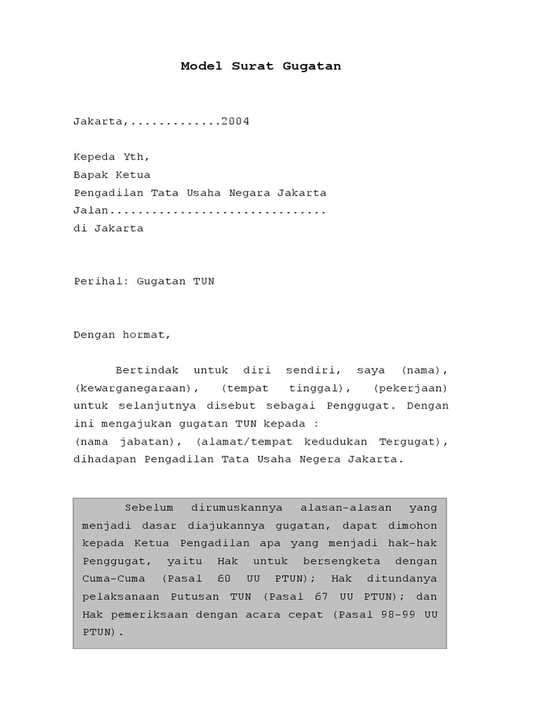 Untuk dapat mendownload contoh surat gugatan ptun dalam format doc silahkan klik link berikut ini. Gugatan pemberhentian secara tidak hormat. Gugatan harus dimasukkan dalam jangka waktu tertentu. Contoh surat kuasa khusus tergugat. Contoh surat kuasa insidentil dan surat permohonan izin insidentil. Bawa sesuai surat menteri pan dan rb nomor b 2838mpan rb09201 tanggal 10 september 2013 tentang laporan hasil audit tujuan tertentu dan laporan hasil evaluasi usulan tenaga honorer kabupaten raja ampat yang selanjutnya ditindak lanjuti oleh tergugat ii dengan menerbitkan surat kepala badan kepegawaian negara nomor.