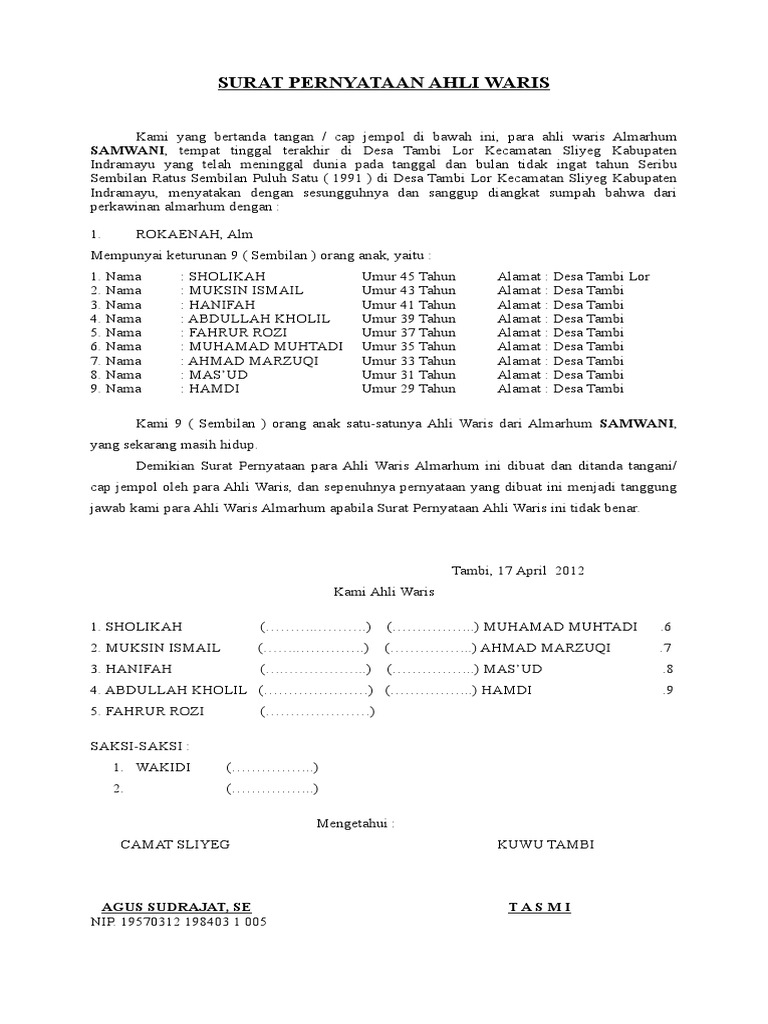 Gulirkan kembali ke puncak laman. Download contoh surat ahli waris doc. Untuk dapat mendownload contoh surat ahli waris dalam format doc silahkan klik link yang tersedia berikut ini. Download contoh surat kuasa ahli waris doc. Nah jika anda saat ini sedang mencari referensi untuk membuat surat keterangan ahli waris ini silahkan simak terus halaman ini sampai selesai. Surat keterangan ahli waris merupakan surat keterangan yang isinya adalah pernyataan bahwa pihak pembuat surat keterangan ahli waris tersebut memang benar benar berhak atas segala sesuatu yang diwariskan oleh seseorang.