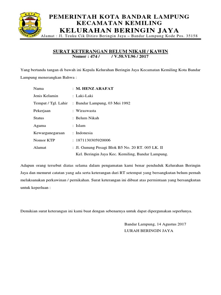 Indonesia 12 agustus 2011. Untuk dapat mendownload contoh surat keterangan belum menikah dalam format doc silahkan anda klik link yang tersedia berikut ini. Semoga dapat menambah wawasan kita semua tentang surat keterangan belum menikah. 15 contoh surat pernyataan belum menikah paling lengkap seiring dengan perkembangan zaman dan kecanggihan teknologi penggunaan surat sebagai media komunikasi juga sudah semakin berkurang saat ini. Sekian dulu penjelasan mengenai surat keterangan belum menikah pada kesempatan kali ini. Sebagai bentuk dukungan anda kepada blog kami silahklah like dan share melalui tombol di bawah.