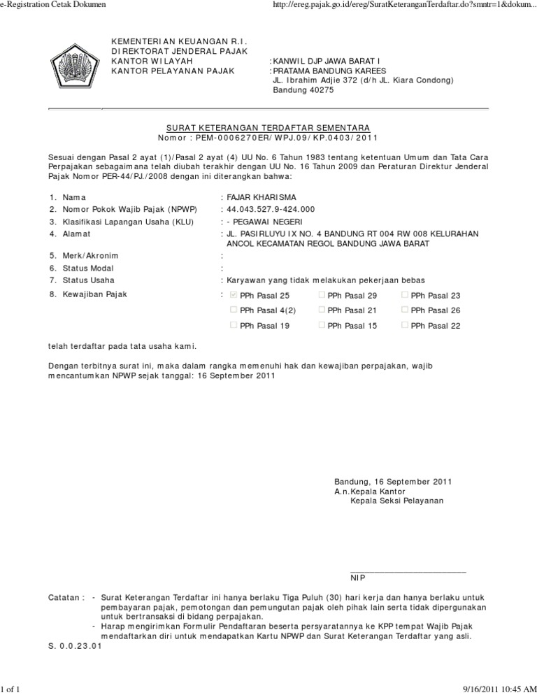 1982 uu wdp wajib daftar perusahaan pada pasal 5 ayat 2 yang berbunyi pendaftaran perusahaan wajib dilakukan oleh pemilik atau penguruspenanggung jawab atau kuasa yang sah. Surat keterangan terdaftar skt adalah surat keterangan yang diterbitkan oleh kantor pelayanan pajak yang menyatakan bahwa wajib pajak telah terdaftar pada kantor pelayanan pajak tertentu yang berisikan nomor pokok wajib pajak dan identitas lainnya serta kewajiban perpajakan wajib pajak.