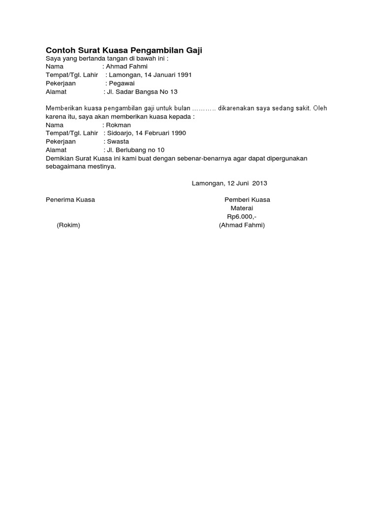 Surat kuasa ambil gaji adalah surat yang berisikan pernyataan bahwa seseorang memberikan wewenang kepada orang lain untuk melakukan suatu pekerjaan yang seharusnya dapat ia lakukan sendiri tetapi karena suatu hal ia tidak dapat melakukan pekerjaannya dalam hal ini adalah pengambilan gaji. Cilacap 12 maret 2000 no ktp. Surat kuasa nantinya menjadi prasyarat bagi pengambilan gaji yang dilakukan oleh orang lain. Namun dilakukan pengecualian apabila pemilik gaji berhalangan untuk mengambil gaji secara langsung. Surat kuasa ini biasanya digunakan oleh seorang karyawan pegawai yang berhalangan hadir untuk mengambil gaji dikarenakan alasan tertentu seperti sakit menjalani masa cuti kerja urusan dinas keluar kota dan alasan lainnya. 15 contoh surat kuasa pengambilan gaji paling lengkap pengambilan gaji pada dasarnya hanya bisa dilakukan oleh orang yang bersangkutan.