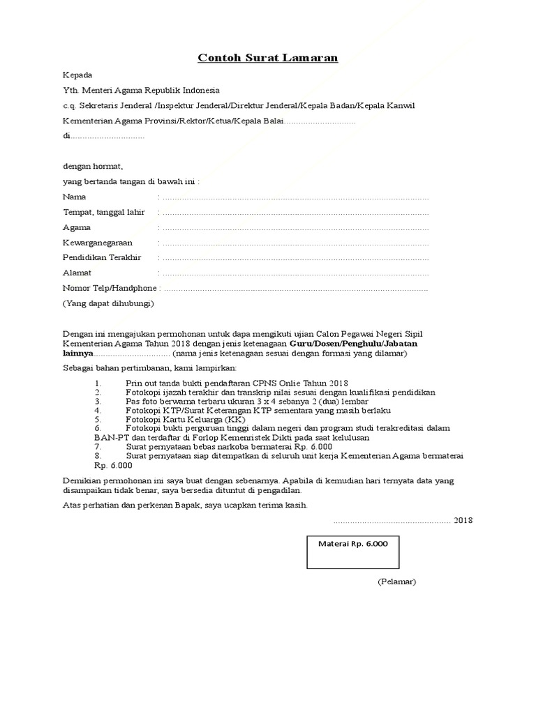 Tentunya dengan ketikan tangan oleh pelamar masing masing. 6000 dan ditandatangani dengan pena bertinta hitam. Format contoh surat lamaran cpns 2019 di kemenkumham kemenag dan kemenlu bisa dilihat di bagian bawah artikel ini. Download contoh surat lamaran cpns kemenag terbaru 2018 melampirkan surat lamaran pekerjaan bagi cpns kemenag tahun 2018 merupakan salah satu syarat yang harus dipenuhisyarat sepeti surat lamaran memang terlihat tidak begitu pokok namun hal tersebut memang harus dipenuhi. Surat lamaran diketik pelamar menggunakan komputer bermaterai rp. Surat lamaran cpns kemenag adalah salah satu syarat wajib untuk melamar cpns kemenag 2018.
