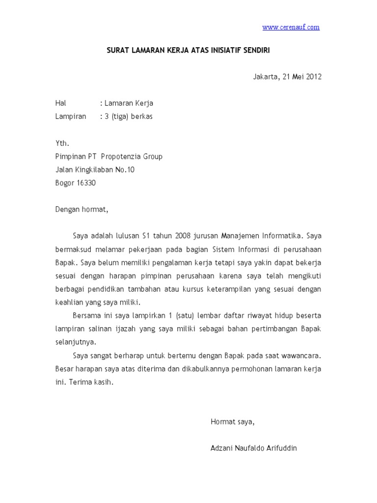 Contoh surat lamaran kerja berdasarkan inisiatif sendiri. Beberapa contoh surat lamaran kerja inisiatif sendiri terbaru yang baik 2019. Surabaya 13 april 2013 hal. Contoh surat lamaran kerja inisiatif sendiri adalah contoh lamaran pekerjaan terbaru yang akan admin bagikan siang ini untuk anda yang ingin melamar pekerjaan di perusahaan perusahaan yang ada disekitar tempat tinggal anda. Pengertian surat lamaran kerja inisiatif sendiri surat lamaran kerja atas inisiatif sendiri adalah surat lamaran kerja yang kita susun berdasarkan niatan pribadi kita sendiri dan ditujukan kepada sebuah instansi lembaga perusahaan untuk mengisi posisi tertentu sesuai dengan kualifikasi yang kita miliki. Contoh surat lamaran pekerjaan berdasarkan inisiatif sendiri malangbong 20 januari 2015 hal. Lamaran pekerjaan lampiran.