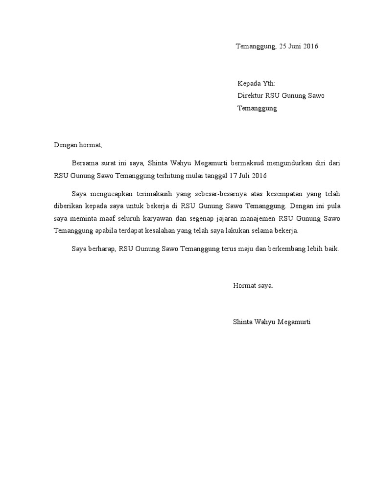 Untuk mempermudah akan saya bagikan ke dalam format doc sehingga langsung dapat anda edit tanpa menulis ulang kembali. Bila anda ingin mendownload contoh surat pengunduran diri dengan format doc silahkan klik link berikut ini. Surat pengunduran diri adalah surat yang dibuat untuk menyatakan bahwa dirinya berhenti bekerja dari tempat atau instansi di mana ia bekerja baik itu bekerja di perusahaan swasta ataupun bekerja di kantor pemerintahan. Contoh surat pengunduran diri kerja. Ketika anda yakin mengundurkan diri dari kantor selama ini prosedur yang menjadi prioritaskan yaitu membuat surat resign. Anda dapat memilih salah satunya saja.