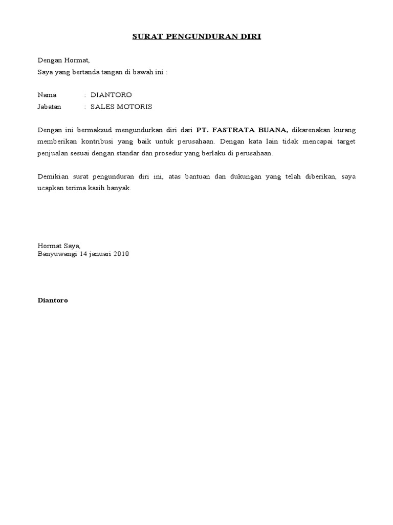 Contoh surat pengunduran diri. Contoh surat pengunduran diri hallo sobat sharingsetelah beberapa waktu lalu saya bahas soal contoh surat lamaran kerja kali ini saya akan sharing tentang contoh surat pengunduran diri contoh surat resign. Contoh surat pengunduran diri dalam dunia kerja pastinya banyak hal yang kita temukan baik itu berupa hambatan suka duka maupun pengalaman kerja yang mungkin belum pernah kita temukan di tempat kerja sebelumnya. Contoh dan format surat pengunduran diri resign sebelumnya saya sudah menjelaskan mengenai surat lamaran kerja yang baik dan benarnah pada kesempatan kali ini saya akan menjelaskan mengenai surat pengunduran diri atau biasa dikenal dengan resign dari pekerjaan. 12 pengasih kulon progo. Contoh surat pengunduran diri dari perusahaan terkadang memang dibutuhkan. Contoh surat pengunduran diri berikut ini 3 contoh surat untuk pengunduran diri karyawan perusahaan dalam format sederhana tapi bisa digunakan secara resmi.