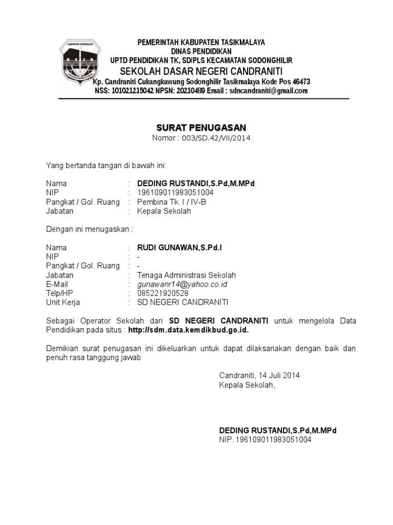 Selain itu di beberapa sekolah terutama sekolah pelosok atau daerah belum tentu ada ptk yang menguasai iptek komputer dan internet maka kepala sekolah seyogyanya mengangkat tenaga operator sekolah untuk tugas tugas data kependidikan. Bagian bagian surat juga hampir sama yaitu kepala surat isi surat penugasan dan penutup. Pada awalnya sekolah cukup menerbitkan satu surat penugasan operator sekolah menjadi contact person sekolah dalam rangka pengelolaan sistem dapodikdas sekolah melakukan pengumpulan perekaman pengelolaan dan pemeliharaan serta pemutakhiran data pada sistem dapodik sekolah secara valid optimal berkala dan berkesinambungan memberikan laporan atas perkembangan dan capaian kegiatan dan. Yang membedakan surat tugas dengan surat resmi lainnya ada di bagian isi bahwa dalam surat tugas dinas harus ada identitas pemberi wewenang atau pejabat atasan identitas pegawai serta instansi yang dituju. Berkas contoh ini berupa surat keputusan kepala sekolah tentang penetapan tenaga operator pendataan dapodik data pokok pendidikan ini mudah mudahan berguna sebagai referensi ditujukan untuk kepala sekolah operator sekolah guru pendidik dan tenaga kependidikan di sekolah baik sd. 15 contoh surat tugas resmi yang baik dan paling lengkap salah satu jenis surat yang sangat sering digunakan oleh perusahaan maupun instansi tertentu adalah surat tugas.