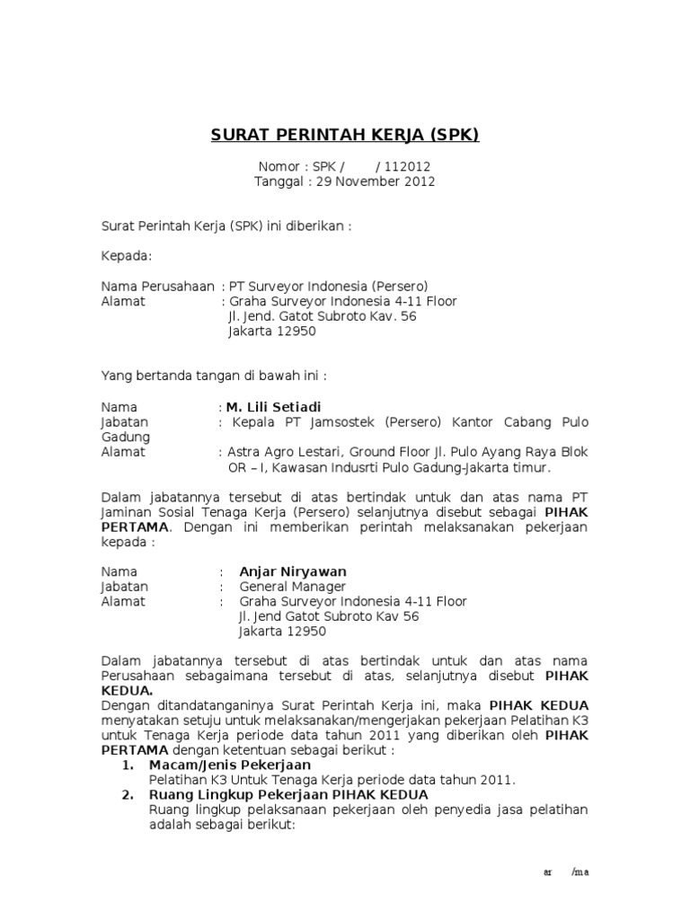 Contoh surat perintah kerja spk. Di dunia kontraktor dan konsultan surat perintah kerja spk ada kalanya disebut dengan surat perintah mulai kerja spmk atau surat perintah melaksanakan kerja spmk. Surat perintah kerja no. Padanan ini juga digunakan oleh bank dunia dan bank pembangunan asia adb. Sebaliknya anda bisa mengcopy contoh surat perintah kerja di bawah ini untuk kemudian diedit pada microsoft word. Namun hal tersebut hanya akan membuang buang waktu anda saja. Karena adanya keterlibatan 2 pihak maka surat ini masuk kedalam surat resmi sehingga harus.