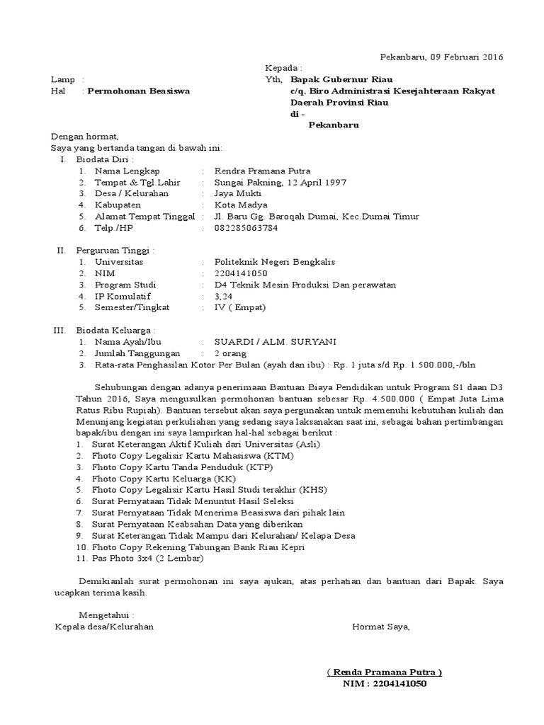 Contoh surat permohonan beasiswa. Contoh surat pengajuan beasiswa populer sebagai referensi membuat surat pengajuan beasiswa yang baik dan benar dengan format resmi. Surat permohonan berisi tentang sebuah permintaan tentang sesuatu hal kepada pihak yang bersangkutan perseorangan badan atau lembaga organisasi perusahaan atau instansi dan lainnya. Pengertian beasiswa merupakan pemberian bantuan keuangan yang diberikan oleh individu atau perorangan yang bertujuan untuk digunakan. Salah satu upaya yang saat ini saya harapkan dari pemerintah daerah kabupaten padang pariaman adalah dapat memberikan bantuan beasiswa bagi mahasiswa asal kecamatan seigeringging kabupaten padang pariaman yang ada di ibu kota kabupaten. Tentu saja caranya dengan membuat surat permohonan beasiswa yang dikirimkan ke pimpinan fakultaskampus. Salah satu caranya adalah dengan memberikan beasiswa kepada siswa atau mahasiswa tertentu.