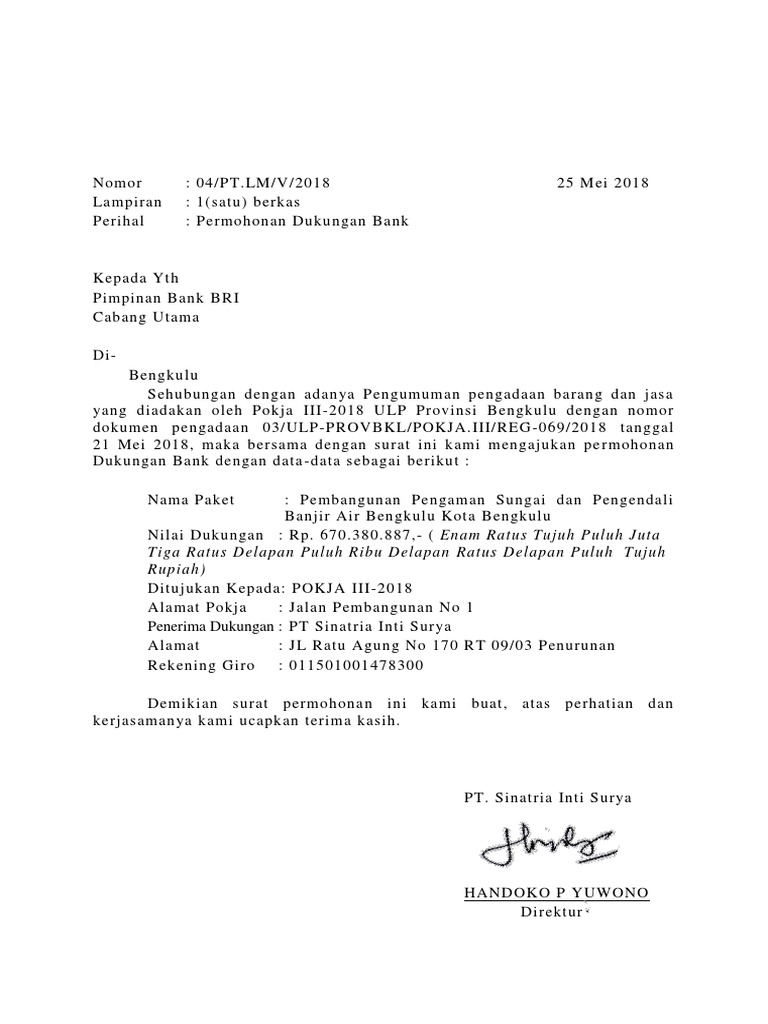 Surat dukungan bank memang terkadang dipersyaratkan di dalam surat dokumen lelang sdp. Surat permohonan dukungan bank dalam pengadaan merupakan surat yang dikeluarkan oleh ptcv perusahaan yang ingin mengikuti pengadaan barangjasa supaya pihak bank mengeluarkan surat dukungan bank yang ditujukan ke panitia pengadaan. Kumpulan contoh format surat permohonan dukungan bank terbaik 2019. Sungai penuh 12 juli 11. 044nicvduk bankvii20111 kepada yth perihal. Itulah beberapa contoh surat permohonan untuk berbagai kepentingan yang dapat kamu jadikan rujukan dalam membuat surat permohonan.