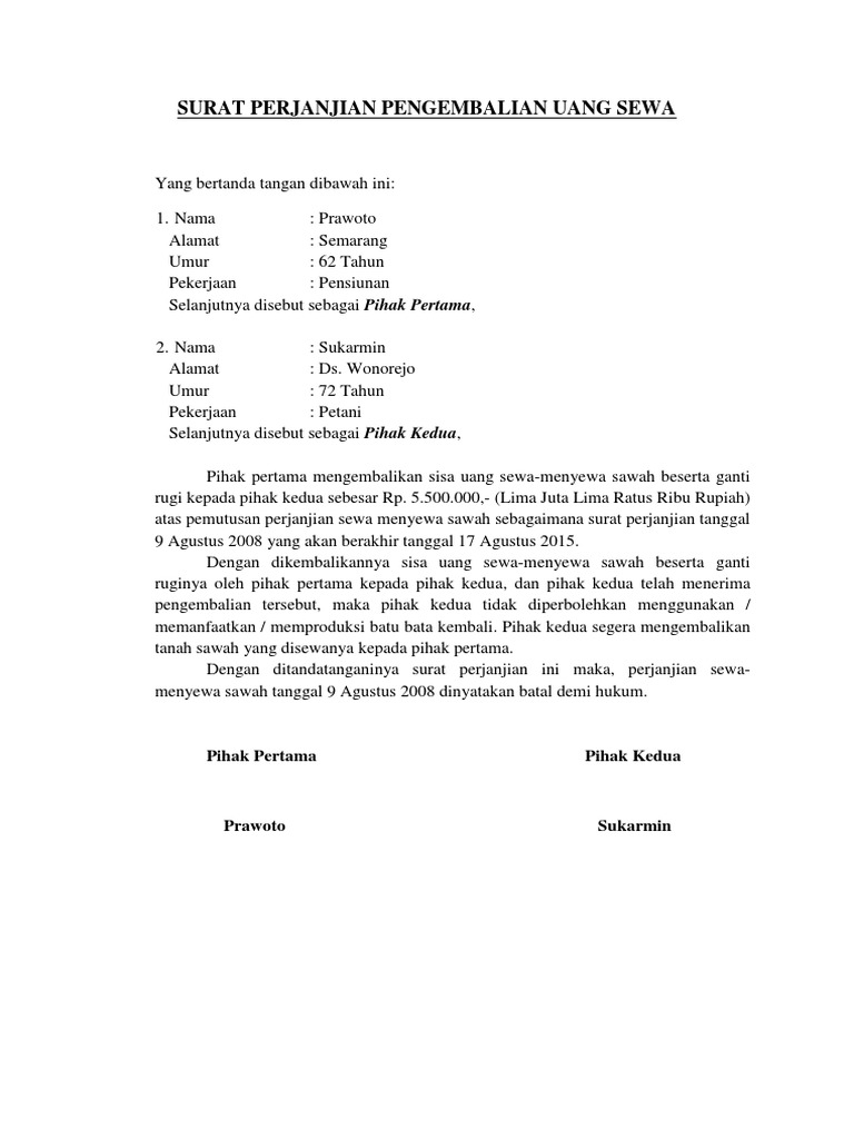 Contoh Surat Perjanjian Pengembalian Uang Muka Info Terkait