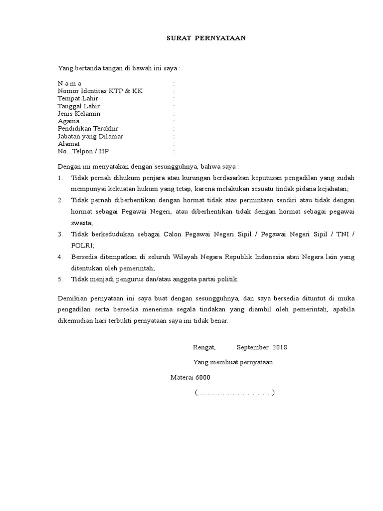 Untuk para cpns 2019 yang sedang mencari kelengkapan dokumen tersebut. Dalam proses pendaftaran pelamar diwajibkan untuk menggunggah dokumen berupa surat pernyataan ke portal sscasn bkn. Mengajukan permohonan untuk mengikuti seleksi pengadaan cpns. Untuk mendownload contoh format surat pernyataan tidak pernah dijatuhi hukuman disiplin tingkat sedang berat klik disini doc. Contoh surat pernyataan cpns 2017 resmi menpan lulusan sma smk d3 d4 s1 s2 semua jurusan bank bumn cpns 2018 daerah provinsi. Berikut ini saya bagikan formatcontoh surat pernyataan tidak pernah dihukum penjara atau kurungan berdasarkan.