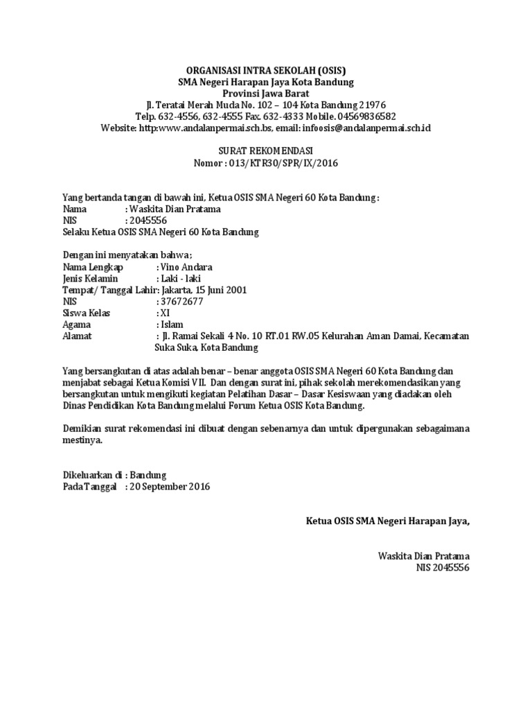 Contoh surat rekomendasi organisasi. Fakta ini biasanya diisi dengan data sesuai permintaan dari orang yang meminta surat rekomendasi tersebut. Memang benar surat keterangan aktif organisasi ini sudah banyak yang ada di internet seperti contohnya surat keterangan aktif organisasi karang taruna unit kegiatan mahasiswa badan eksekutif mahasiswa. Surat rekomendasi biasanya dibuat untuk merekomendasikan atau rujukan dari pemegang kepada pemegang surat dari institusi tertentu atau perorangan untuk memberikan. Dalam acara forum atau perwakilan atas nama suatu organisasi maka siapapun yang akan ditugaskan harus membawa surat rekomendasi dari organisasinya. Salah satu yang kerap dicari adalah contoh surat rekomendasi. 15 contoh surat rekomendasi yang baik dan paling lengkap jika diartikan secara sederhana maka surat rekomendasi bisa diartikan sebagai surat yang dibuat oleh seorang pimpinan atau pejabat tertentu yang berisi keterangan tentang seseorang berdasarkan fakta fakta yang ada.