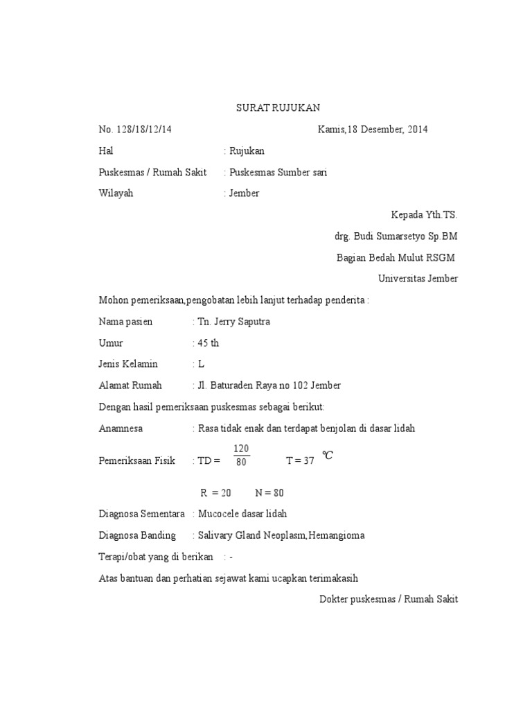 Apakah pasien bisa meminta surat rujukan dari faskes tingkat 1 puskesmaspoliklinik. Puskesmas klinik kemudian jika tidak dapat diselesaikan di faskes maka faskes 1 akan memberikan rujukan ke faskes lanjutan rumah sakit kepada pasien. Pemberian obat analgetik untuk meredakan rasa sakit demikian surat rujukan ini kami kirim kami mohon balasan atas surat rujukan ini. Surat keterangan tidak mampu. Contoh mou dgn vendor. Berikut informasi sepenuhnya tentang contoh surat rujukan puskesmas ke rumah sakit.