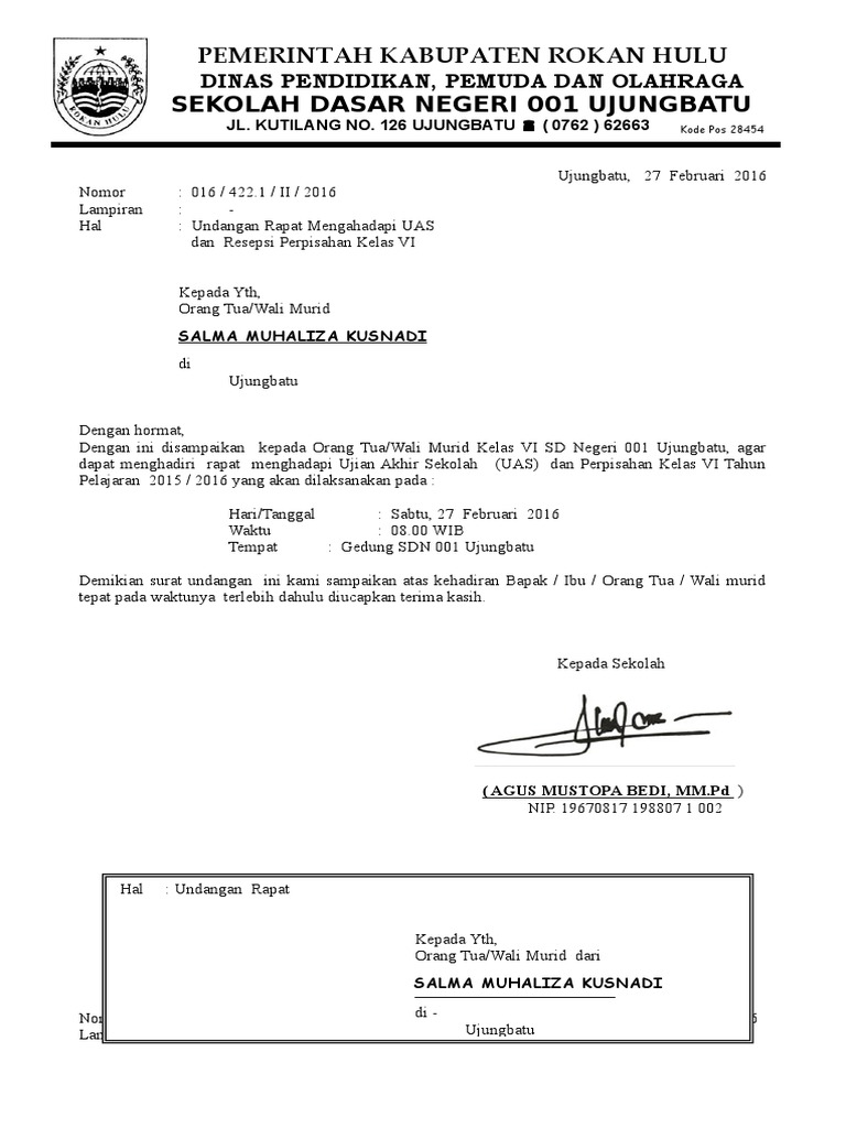 Format surat tentunya memuat kop sekolah madrasah kepala surat isi surat serta penutup serta harus diketik dengan rapi dan jelas khususnya waktu tanggal tempat dan kegiatan agar surat undangan tersebut efektif tentunya juga harus bubuhi. Tidak perlu bertele tele atau langsung mengutarakan maksud dan tujuan secara singkat padat dan sejelas mungkin. Contoh surat undangan orang tua wali muridsurat merupakan dokumen penting yang harus diarsipkan oleh setiap sekolah. Biasanya surat undangan ini diberikan kepada orang tuawali murid kepada kepala sekolah atau guru pensiuan yang sudah pernah mengajar di sekolah tersebut. Surat pemberitahuan sekolah ini dibuat secara resmi dengan adanya cap stempel sekolah dan tandatangan kepala sekolah. Maka dari itu surat dinas sekolah disebut dengan salah satu contoh surat resmi.